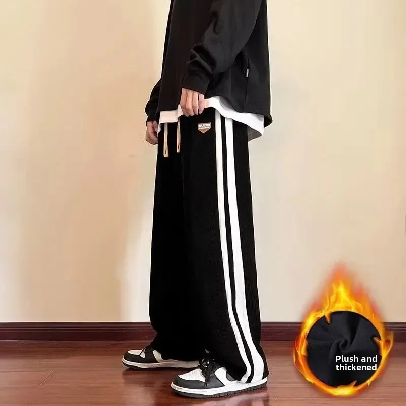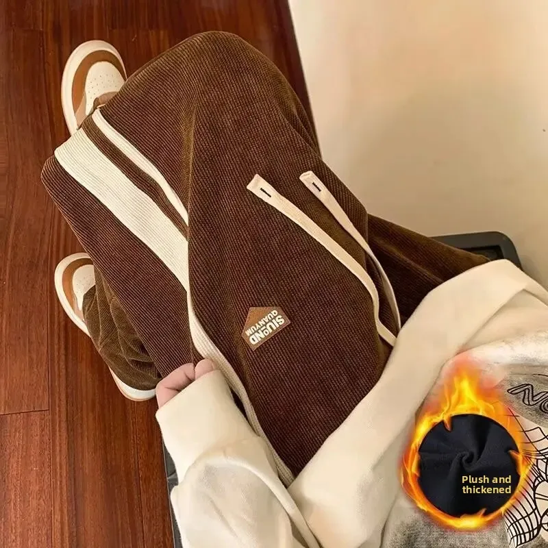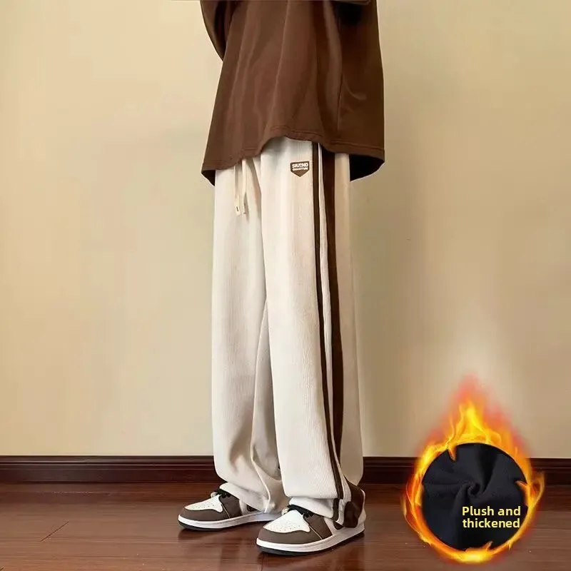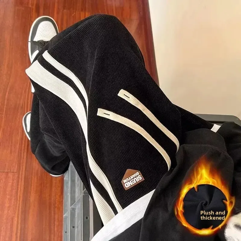 Men's Corduroy Pants Autumn Winter Loose Drapey Trendy American Sweatpants Sporty Casual Fleece Lined Long Trousers