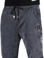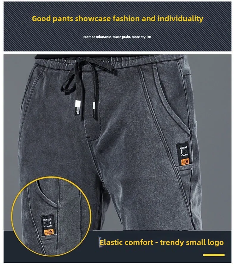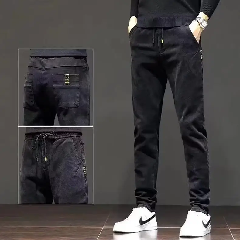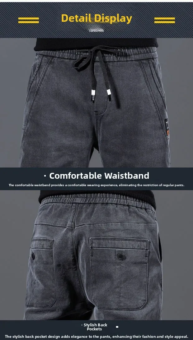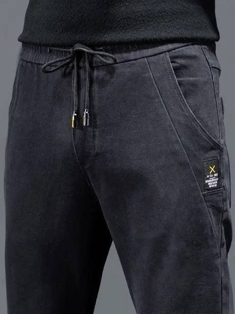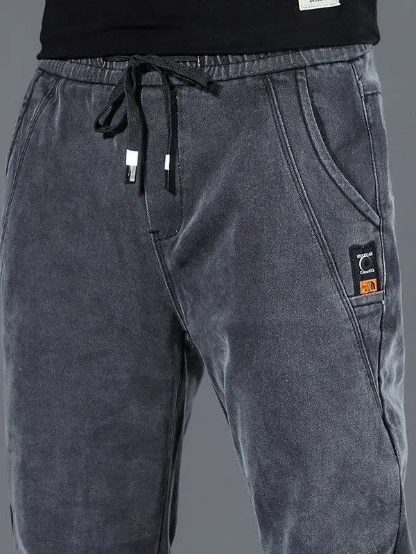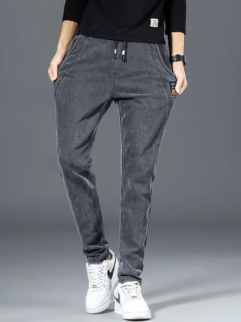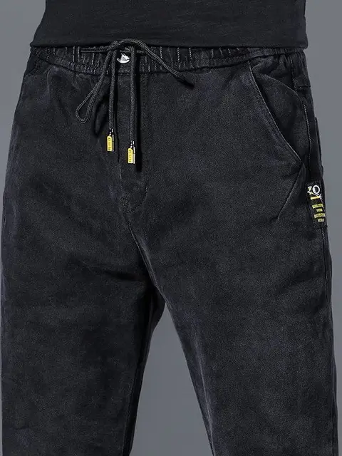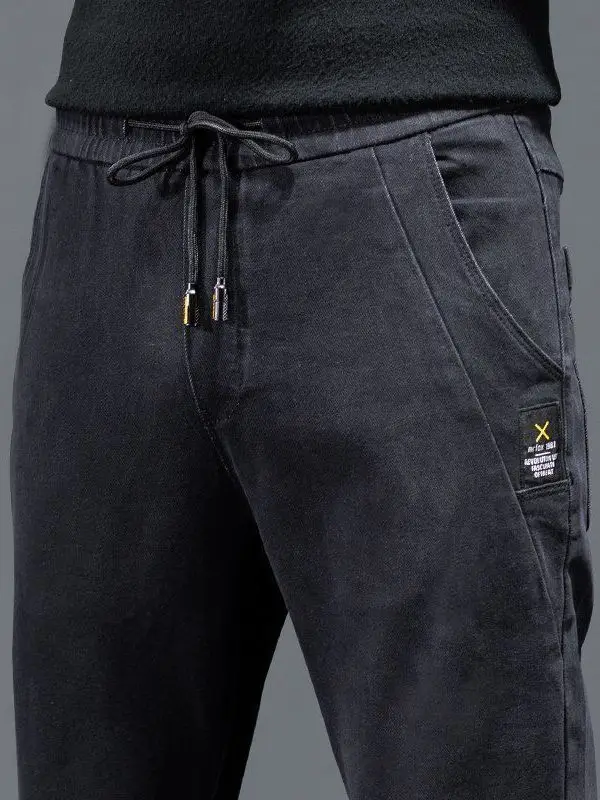 These jeans boast a trendy design with their drawstring waist and patchwork details, making them a stylish choice.