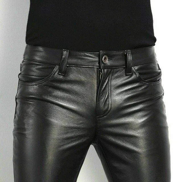 Men's Leather Pants Straight Fit Elastic PU Leather Trousers Motorcycle Pants Thin