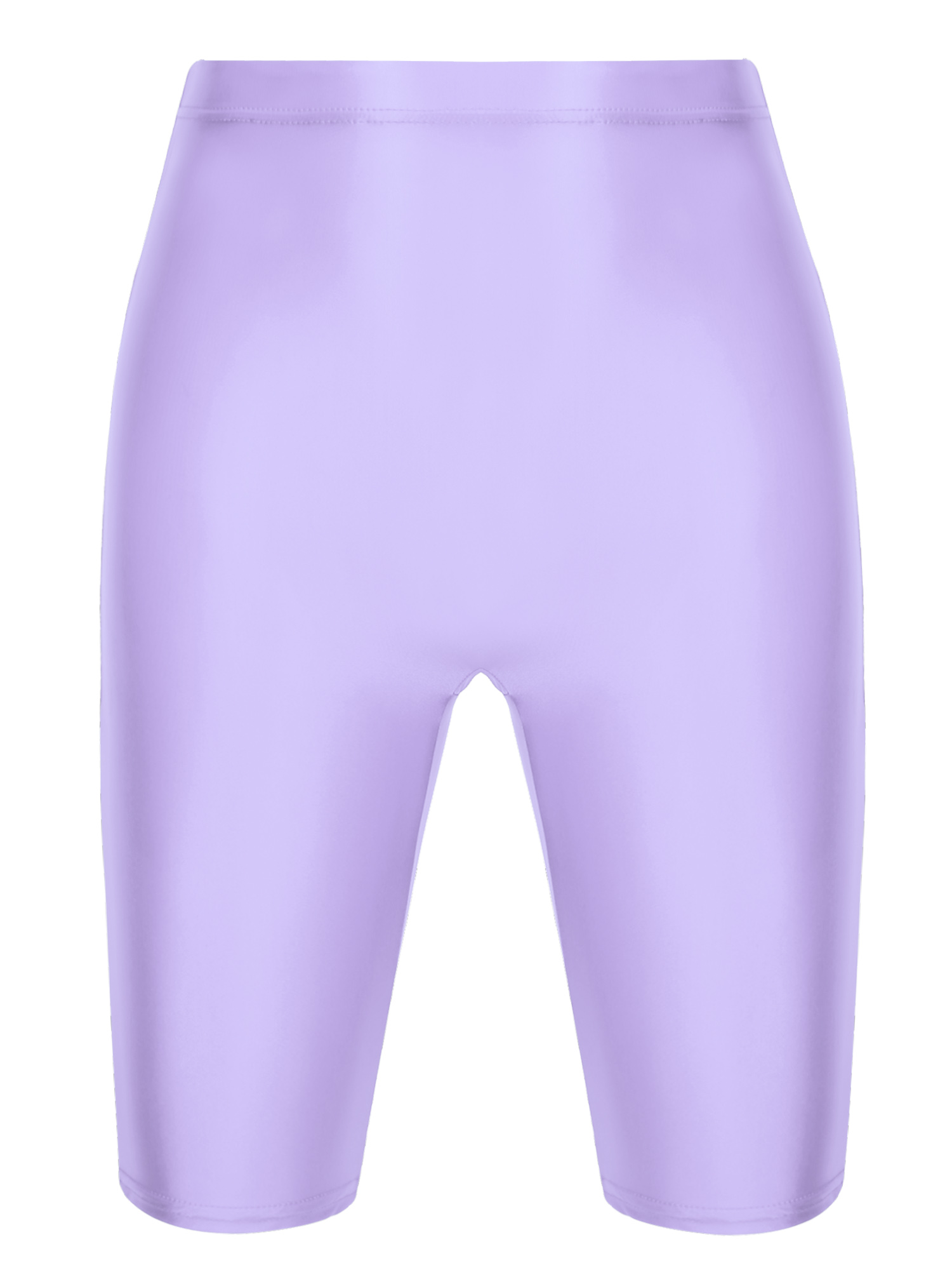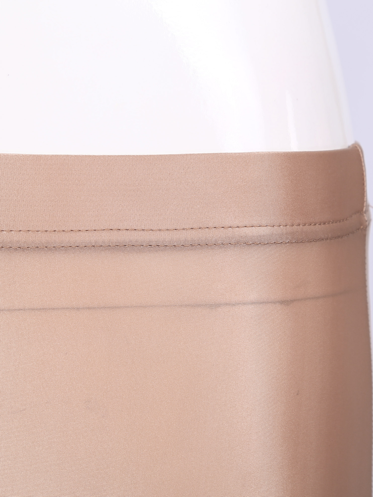 Glossy appearance, above knee length, with elastic waistband for comfy fit.