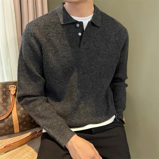 Mens Knit Sweater Autumn Winter Pullover Korean Soft Heavyweight Knit Polo Sweaters Minimalist Long Sleeve