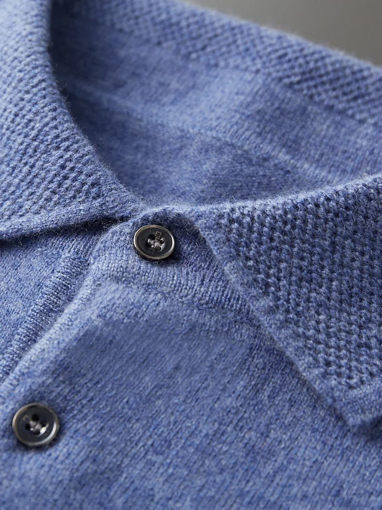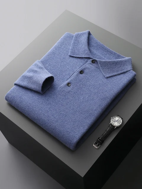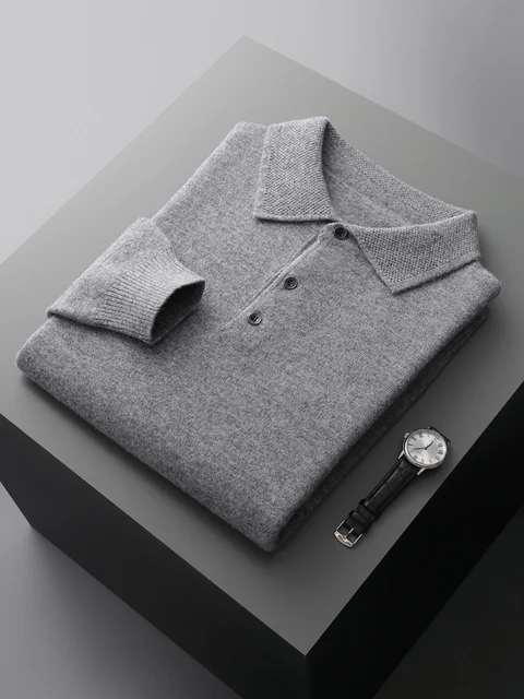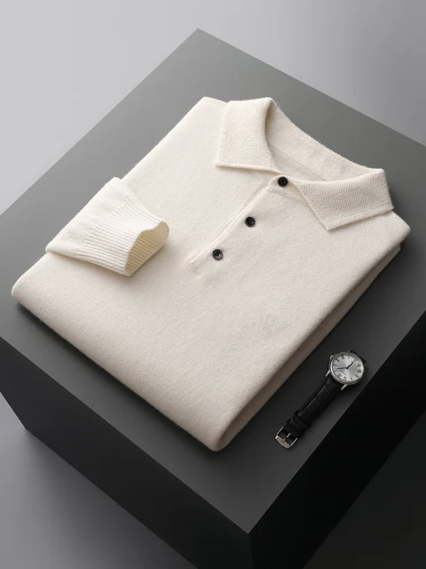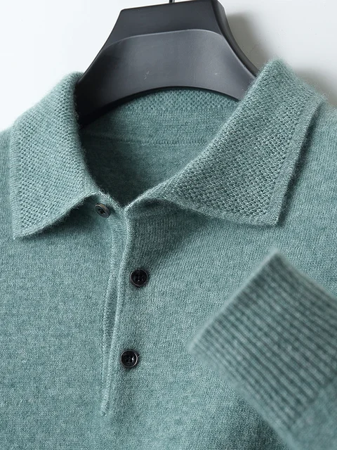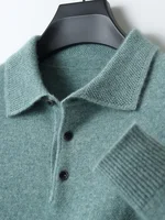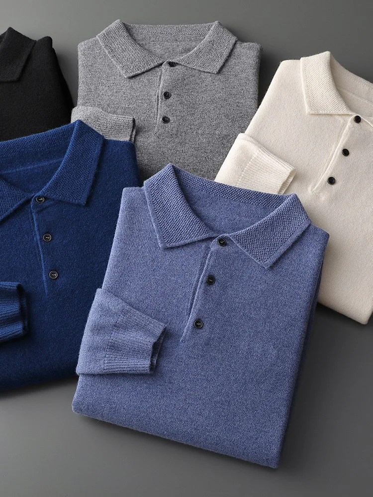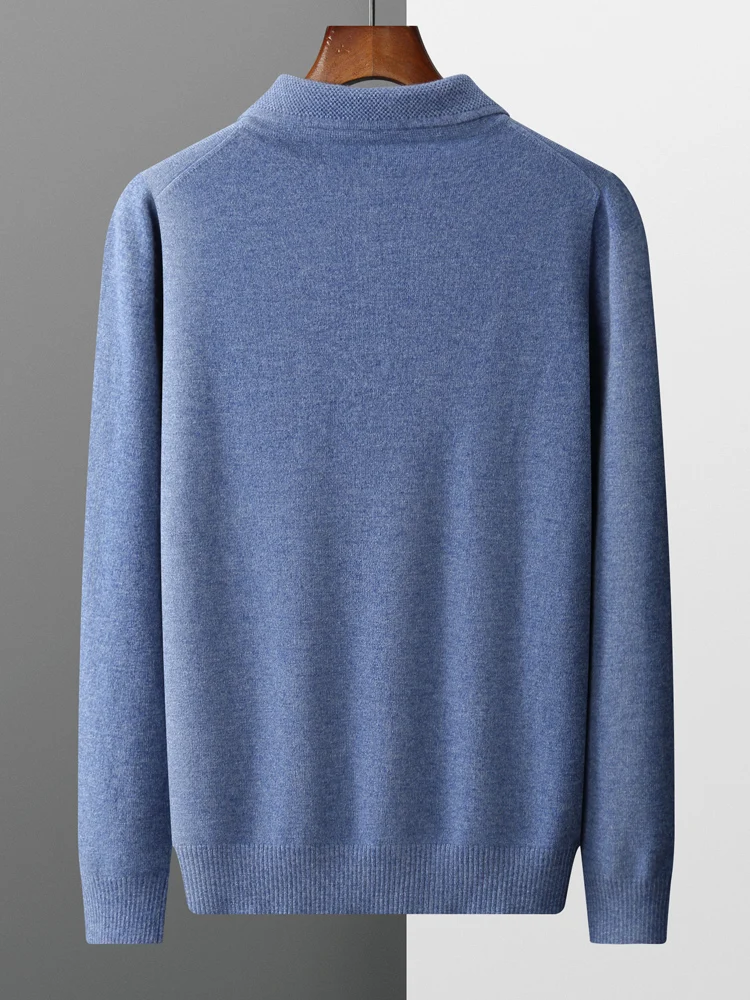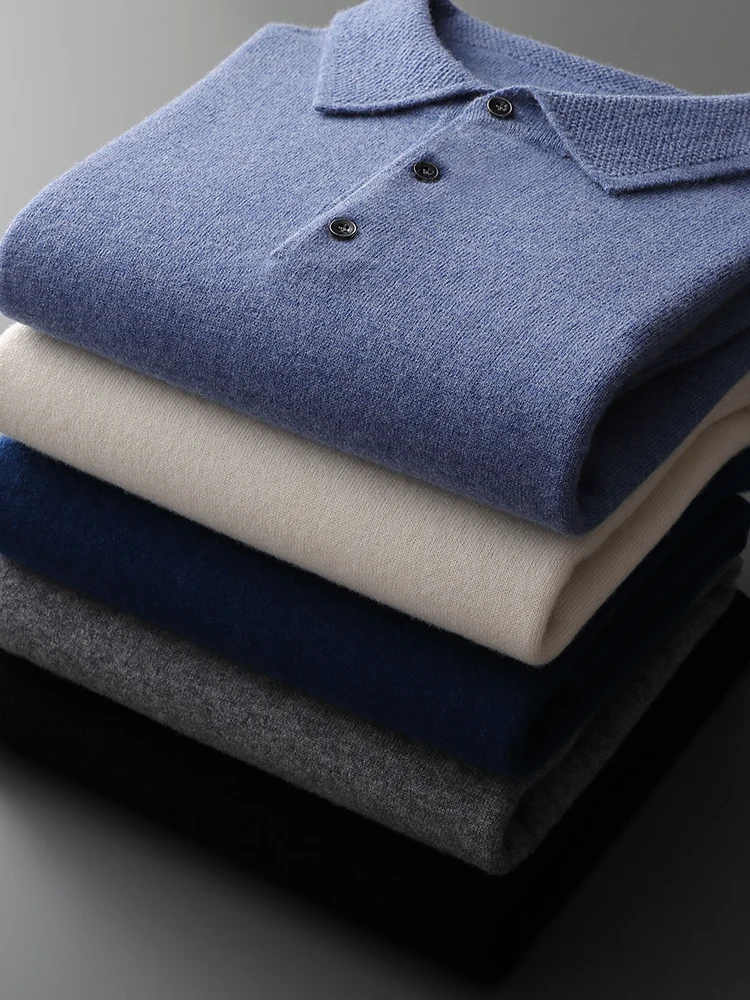 Men's Lapel Knit Pullover 100% Pure Wool Sweater Large Size Spring Autumn Winter Warm Tops Youth Casual Polo Collar T-shirt