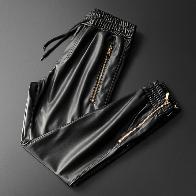 Men’s Leather Pants Superior Quality Elastic Waist Jogger Pants PU Leather Motorcycle Trousers Biker’s Pants