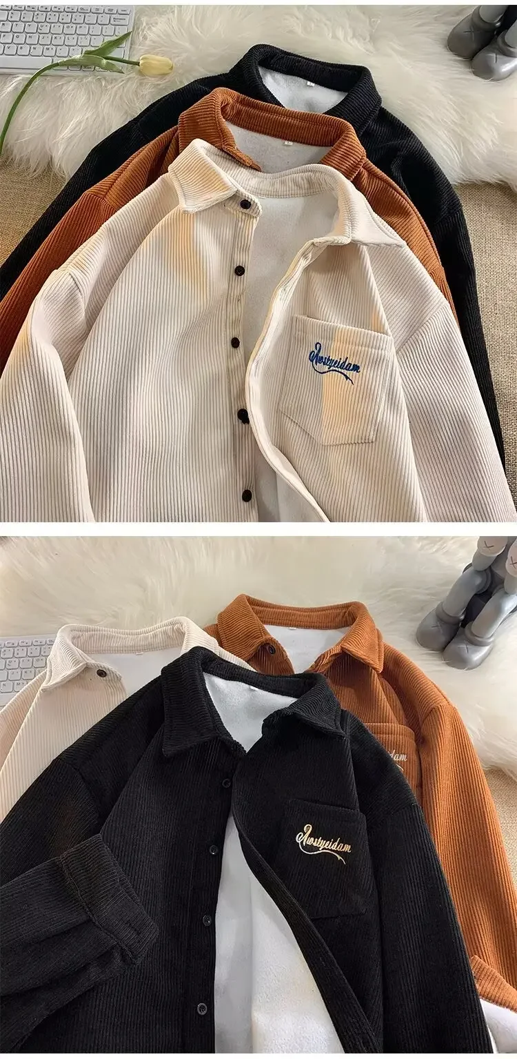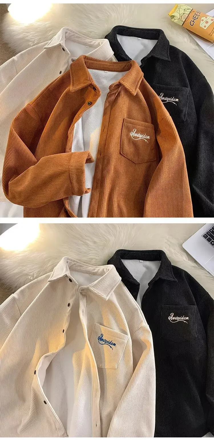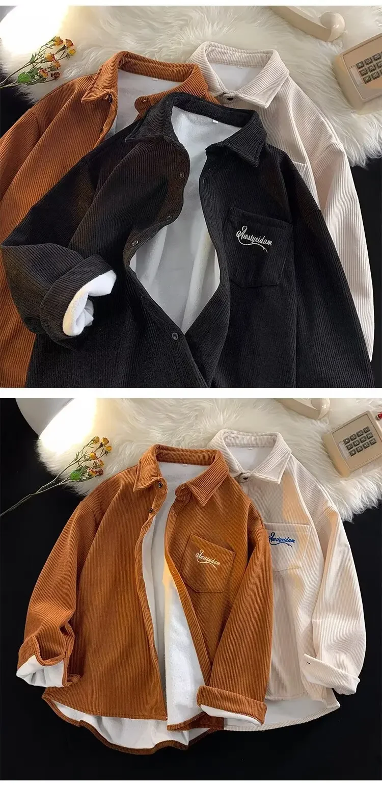 Men's Long Sleeve Corduroy Shirt Fleece Lined Casual Oversize Leisure Coat Autumn Winter American Retro Style