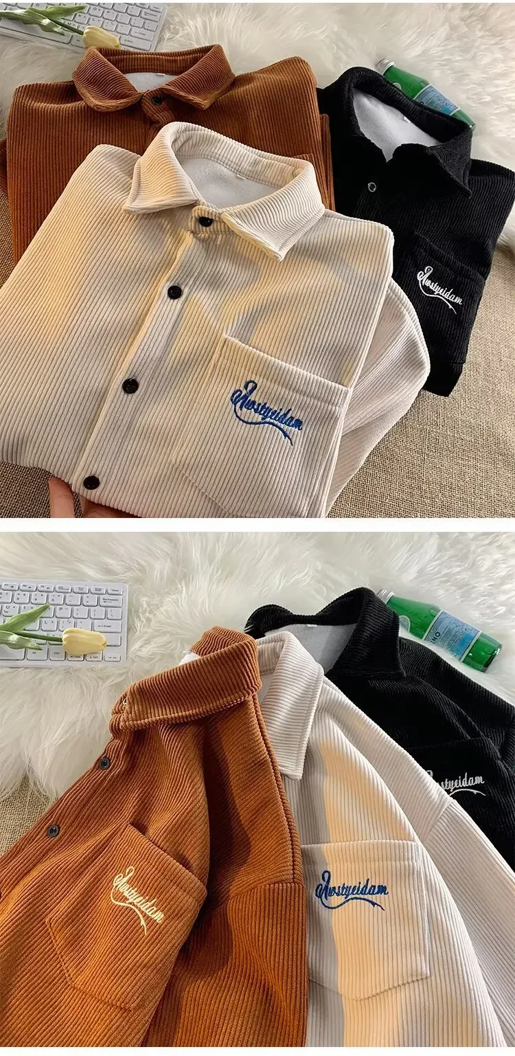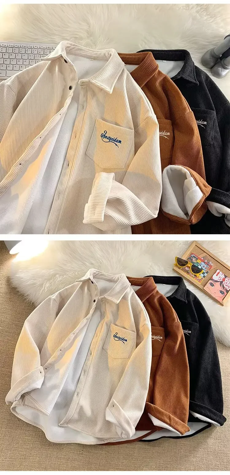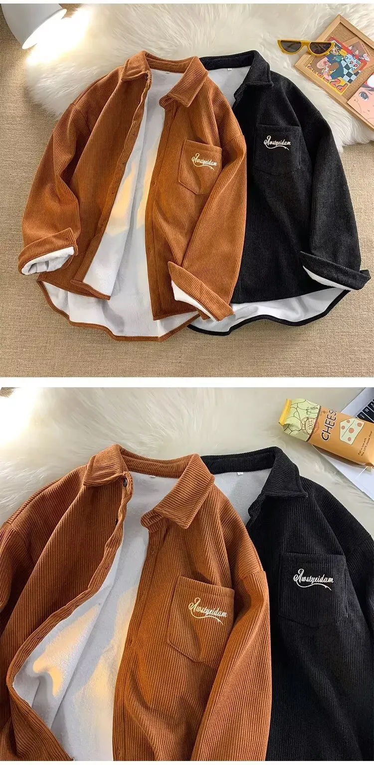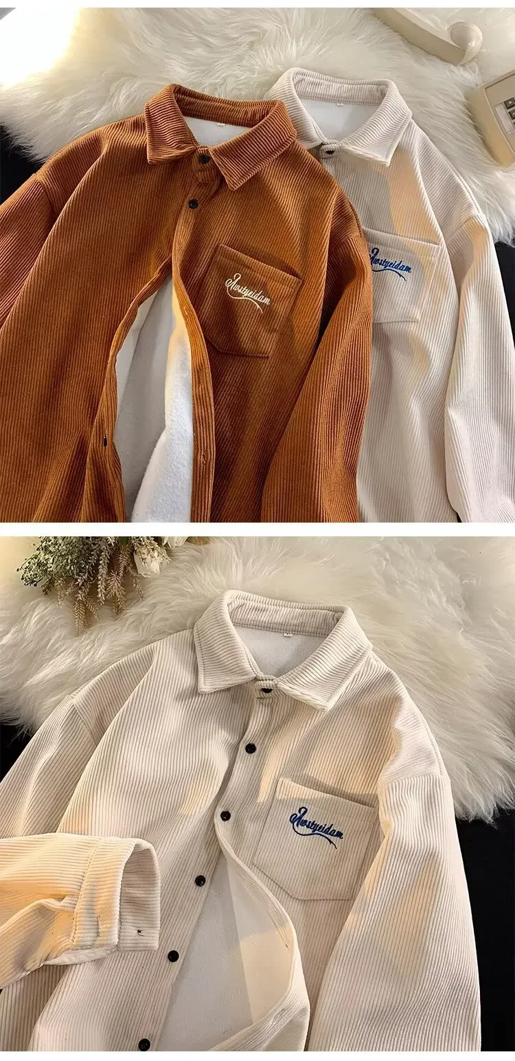 Men's Long Sleeve Corduroy Shirt Fleece Lined Casual Oversize Leisure Coat Autumn Winter American Retro Style