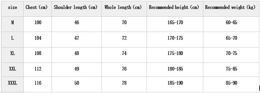 | size_info | {"sizeInfoList":[{"length":{"cm":"100","inch":"39.37"},"size":"M","vid":-1},{"length":{"cm":"104","inch":"40.94"},"size":"L","vid":-2},{"length":{"cm":"108","inch":"42.52"},"size":"XL","vid":-3},{"length":{"cm":"112","inch":"44.09"},"size":"XXL","vid":-4},{"length":{"cm":"116","inch":"45.67"},"size":"XXXL","vid":-5}]} |