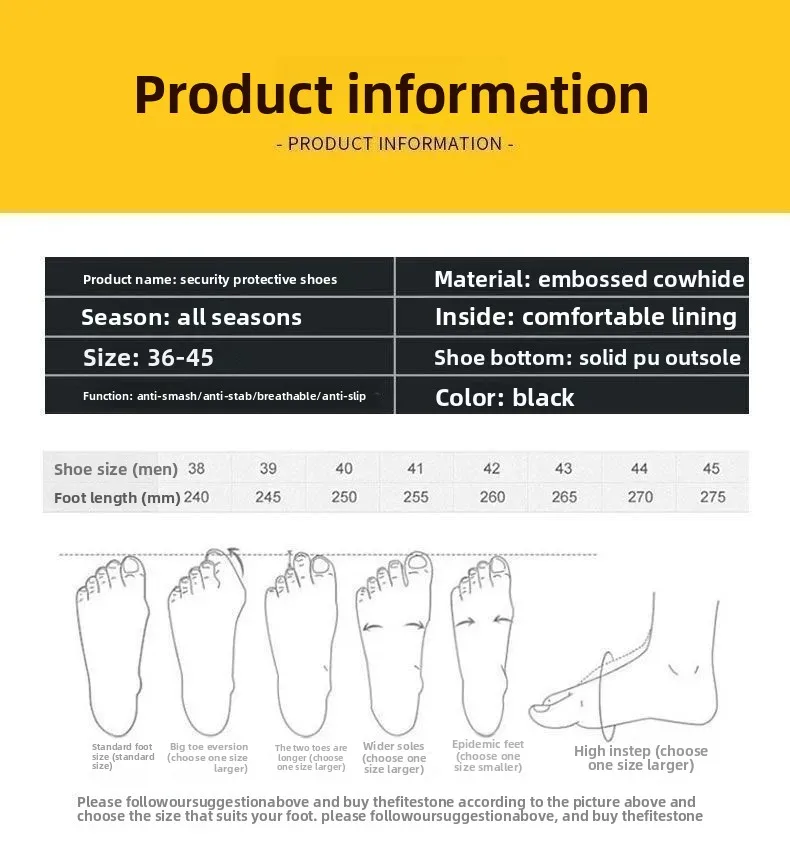• Anti-smashing & Anti-puncture Design : These safety protection shoes are designed to withstand heavy impacts and punctures, ensuring your feet remain safe in hazardous work environments.