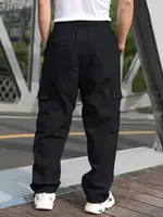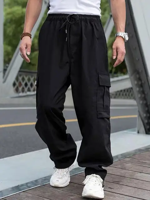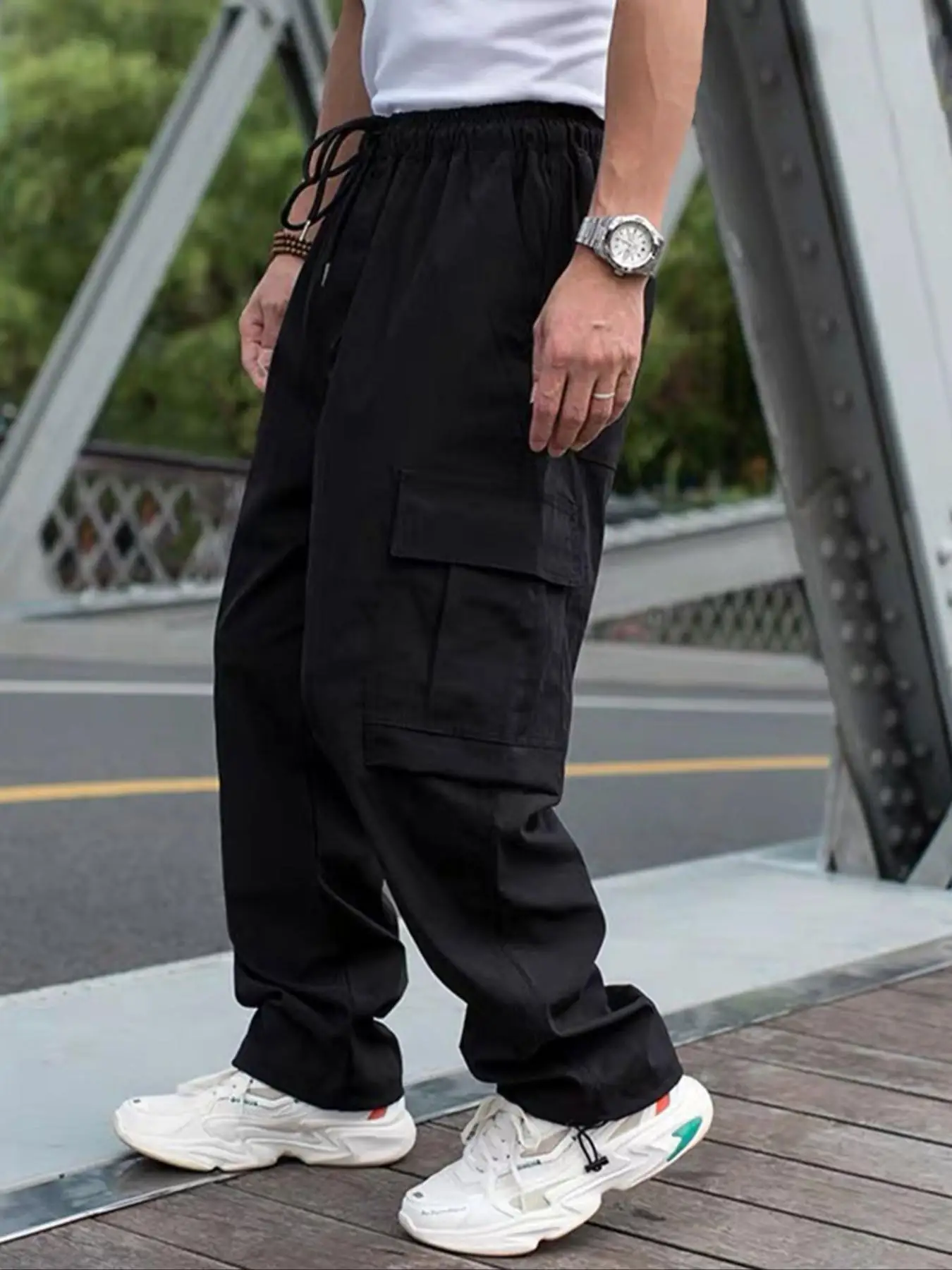 Men’s Solid Color Flap Pocket Drawstring Waist Cargo Pants Regular Fit Casual Street Straight Leg