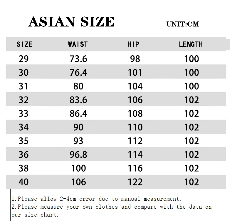 | size_info | {"sizeInfoList":[{"length":{"cm":"73","inch":"28.74"},"size":"29","vid":-1},{"length":{"cm":"76","inch":"29.92"},"size":"30","vid":-2},{"length":{"cm":"80","inch":"31.50"},"size":"31","vid":-3},{"length":{"cm":"83","inch":"32.68"},"size":"32","vid":-4},{"length":{"cm":"86","inch":"33.86"},"size":"33","vid":-5},{"length":{"cm":"90","inch":"35.43"},"size":"34","vid":-6},{"length":{"cm":"93","inch":"36.61"},"size":"35","vid":-7},{"length":{"cm":"97","inch":"38.19"},"size":"36","vid":-8},{"length":{"cm":"100","inch":"39.37"},"size":"38","vid":-9},{"length":{"cm":"106","inch":"41.73"},"size":"40","vid":-10}]} |