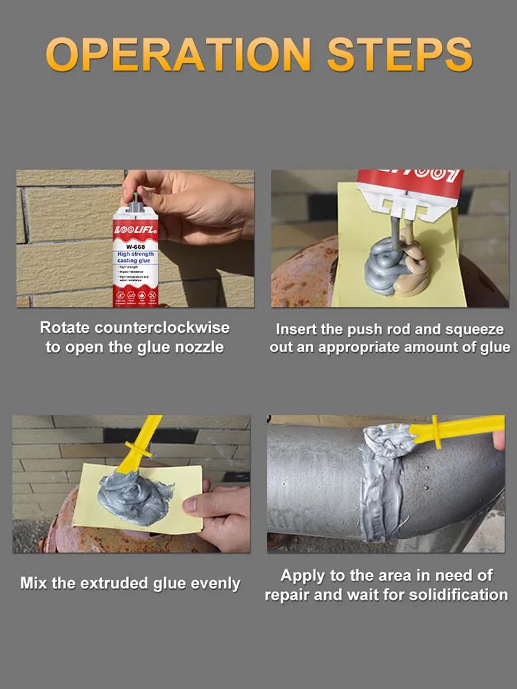 # The products are of high quality and once cured, the metal repair adhesive forms a strong and stable bond. Compared with traditional epoxy resin, this product has added metal powder, high adhesion and good hardness, as well as a certain toughness.