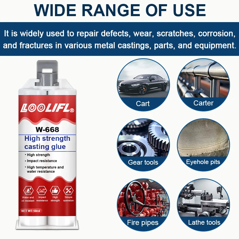 # Wide range of uses: metal putty liquid repair adhesive is suitable for adhesive repair welding of metal, aluminum, steel, stainless steel, ceramics, glass and many plastics. It can be used not only for repairing fuel tanks, pipes, broken concrete, water tanks and plastic buckets, but also for boats, cars, fuel tanks, heaters, vases, fences welded car bumpers and motorcycle crack repair.