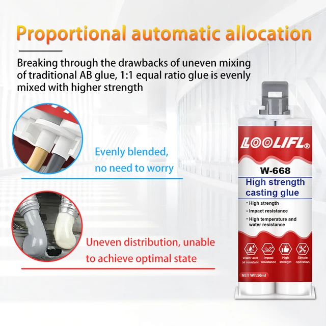 # Highly efficient product design, 1:1 ratio can be accomplished by squeezing out the glue with a pusher. It is ready to use after mixing evenly.