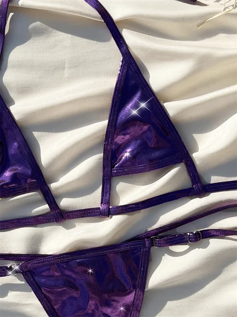 Metallic Purple Bikini Hollow Out Extreme String Tanga Swimsuit Triangle Swimwears Shiny Beach Summer
