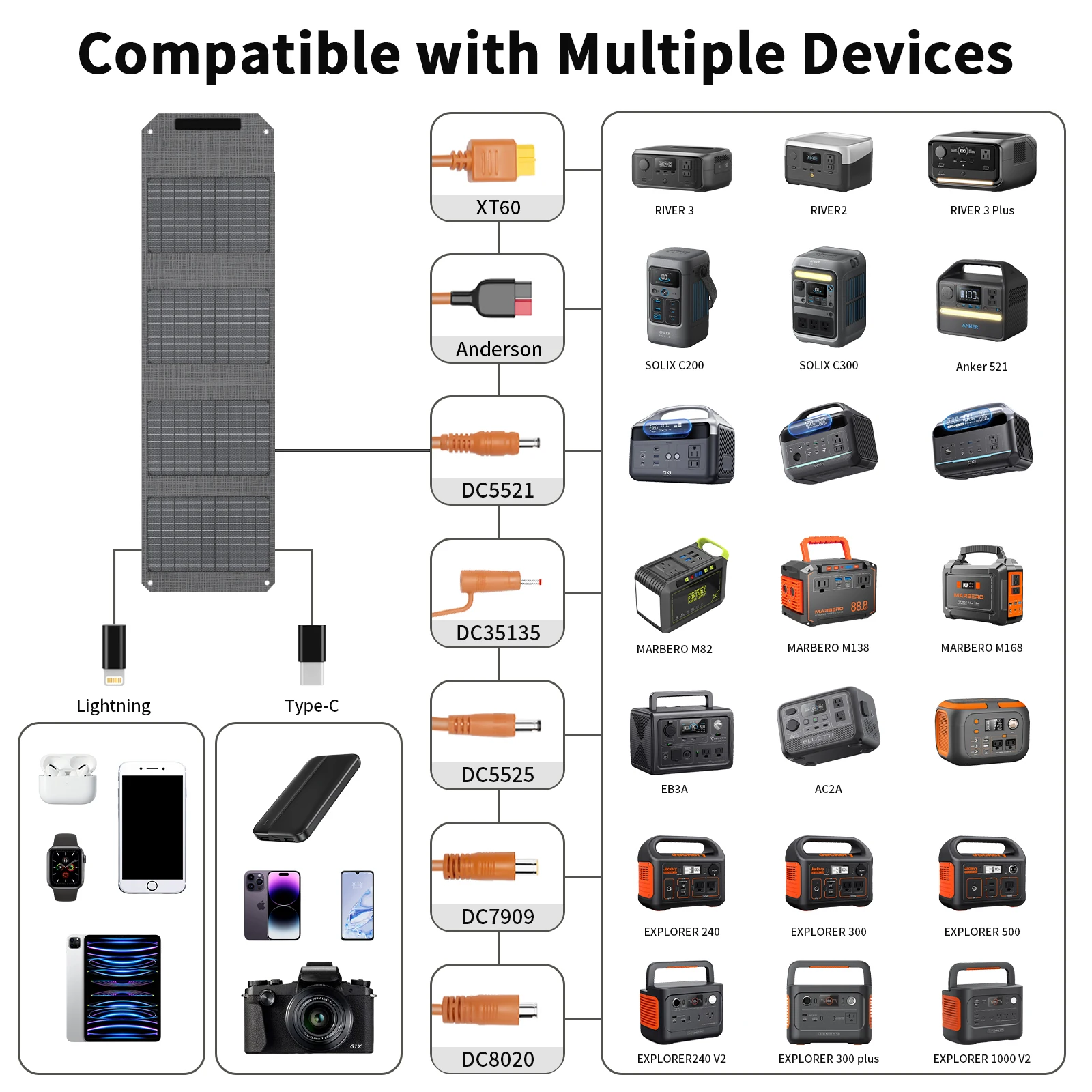 【3 Output Ports】The 40W camping solar panel has 3 distinct output ports: 1 DC output(5A Max), 1 USB-C output, and 1 USB A. It can charge your phone, iPad, laptop, camera, GPS, power bank, and other devices wherever you are. Please note the maximum voltage and current per port