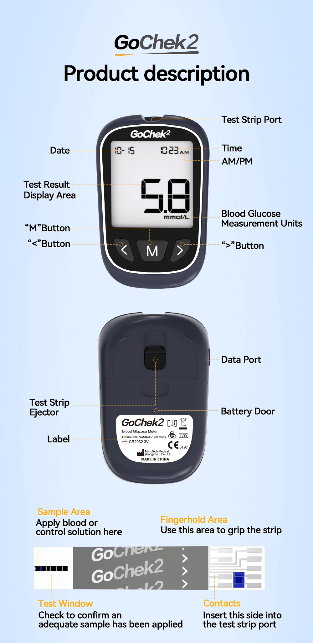2. Measurement Range: 0.6-33.3mmol/L (10-600 mg/dL)