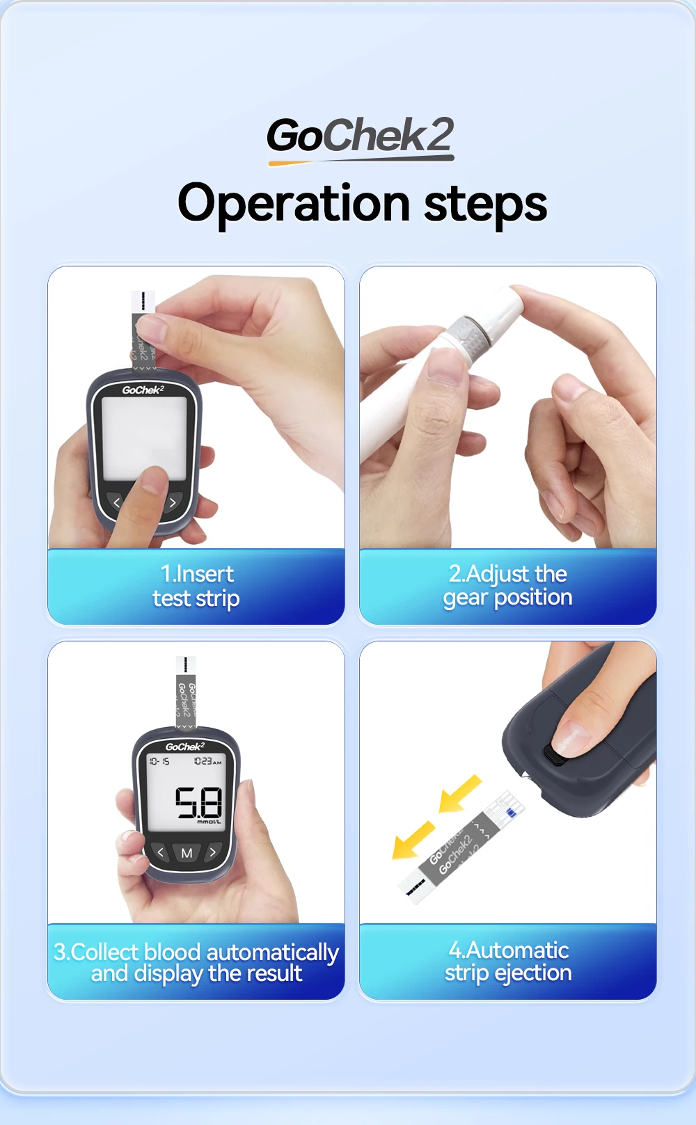 1️⃣ Insert the test strip into the meter.
