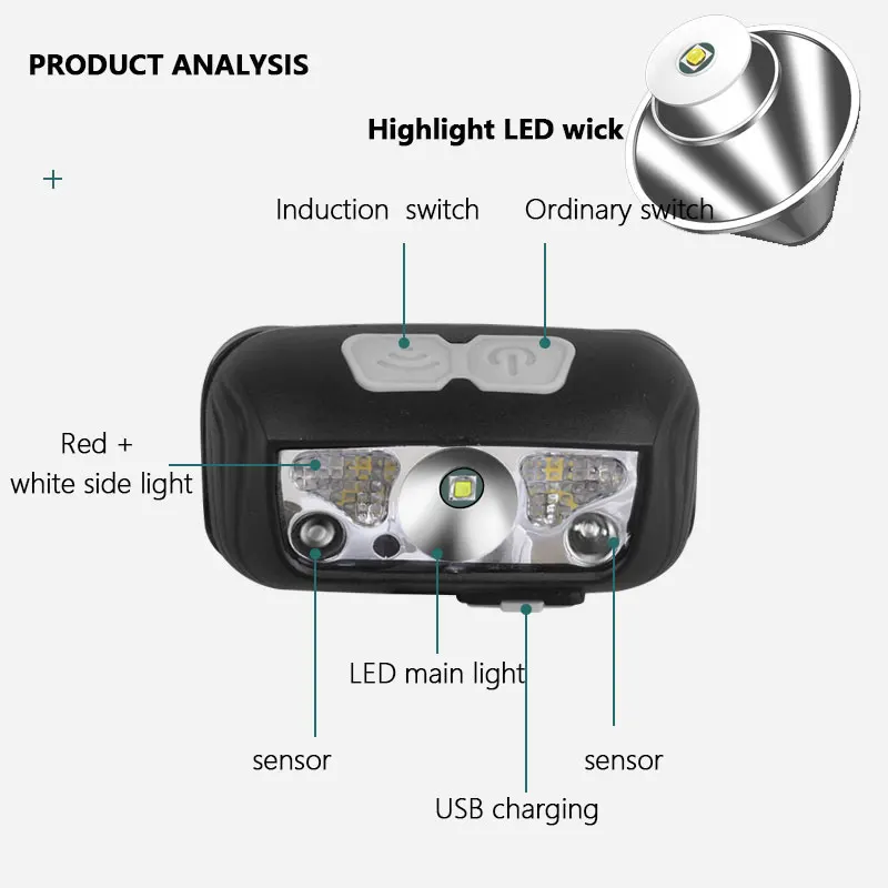 1.The Finger Induction Headlight, When your hand is near to the headlight within 15 cm, the headlight will turn on, when you finger left the headlight , it will be turn off.