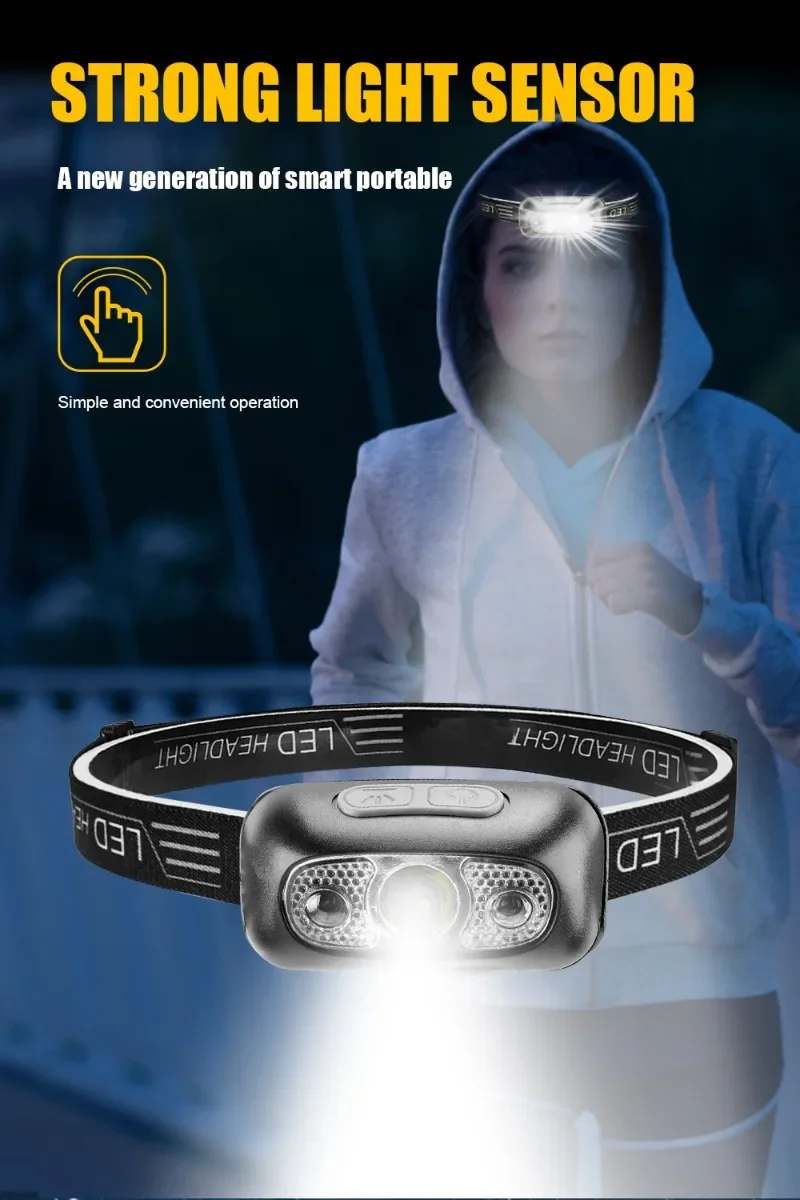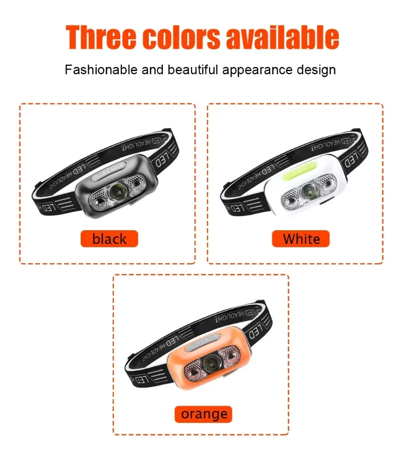 Package contains: sensor headlamp + retractable light belt + USB charging cable