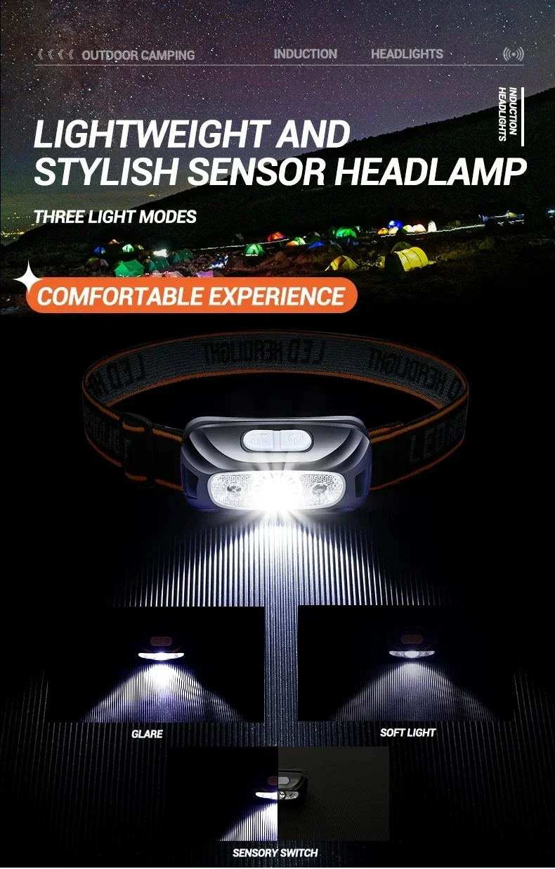 Package contains: sensor headlamp + retractable light belt + USB charging cable