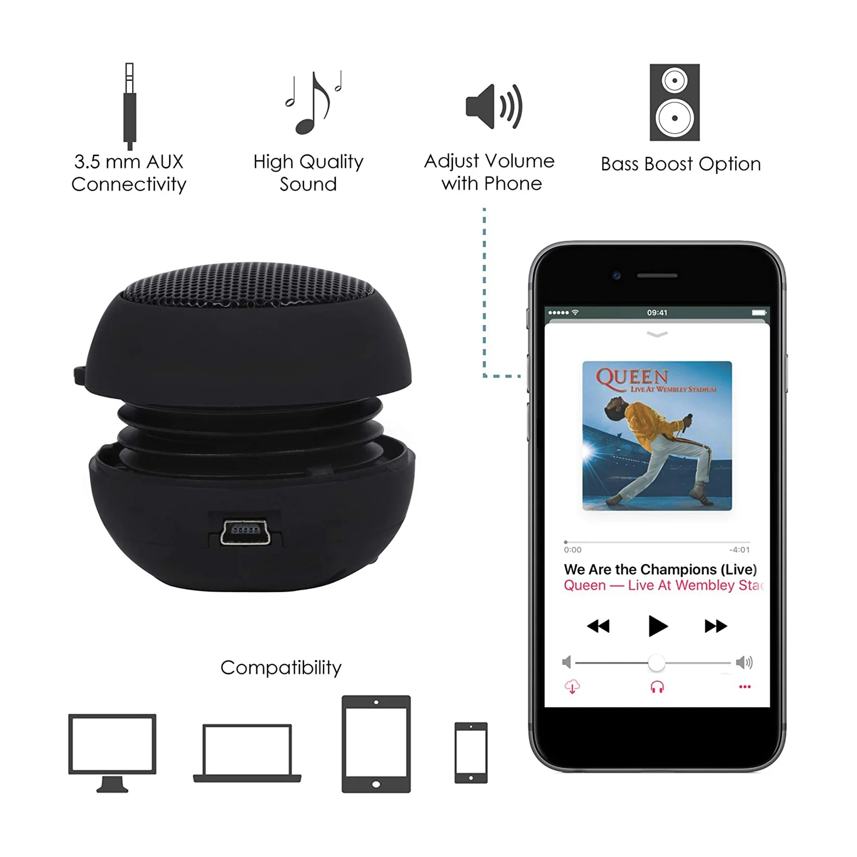 With its conveniently stored 3.5mm line in cable, the speaker is compatible with any device that has a headphone port. No complicated setup process just plug in and play, you’ll be enjoying your favourite music in seconds. COMPACT DESIGN; Super small design allows you to take it anywhere & fits in your pocket