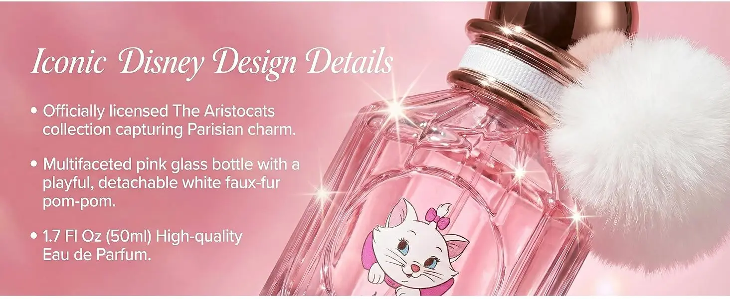 Iconic Disney Design: Officially licensed Marie (The Aristocats) collection. The multifaceted pink glass bottle features a playful, detachable white faux-fur pom-pom, capturing the Parisian charm and elegance of the beloved kitten.