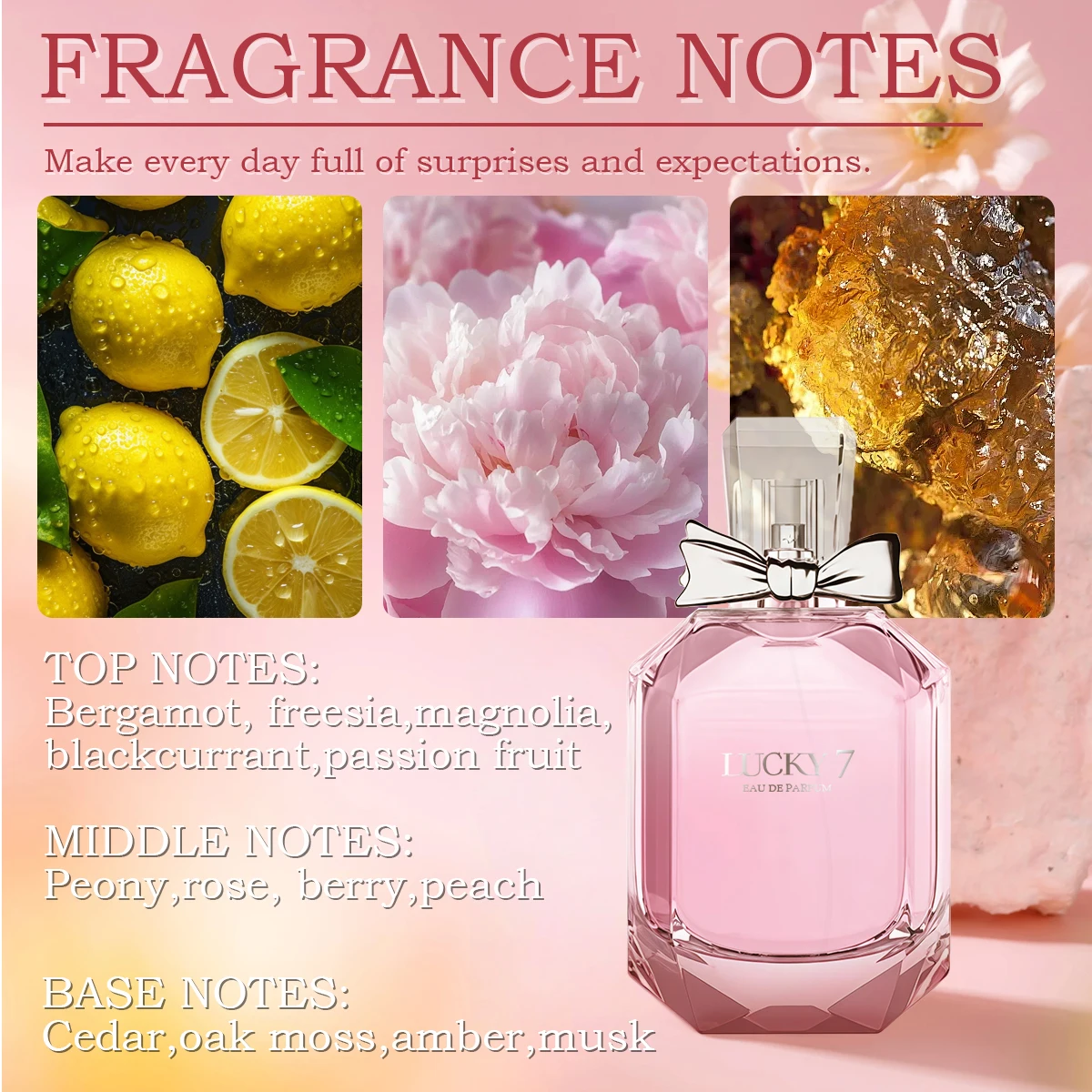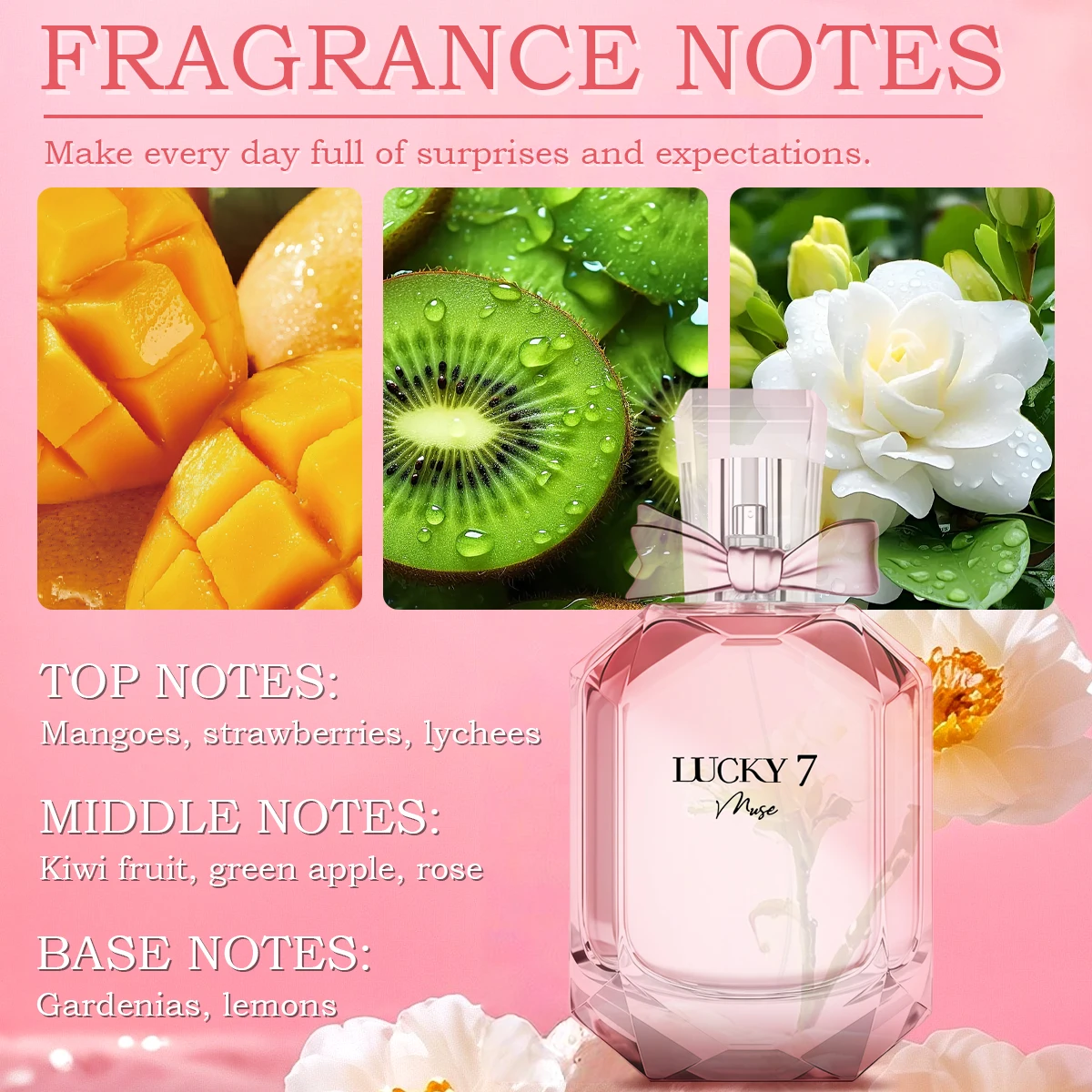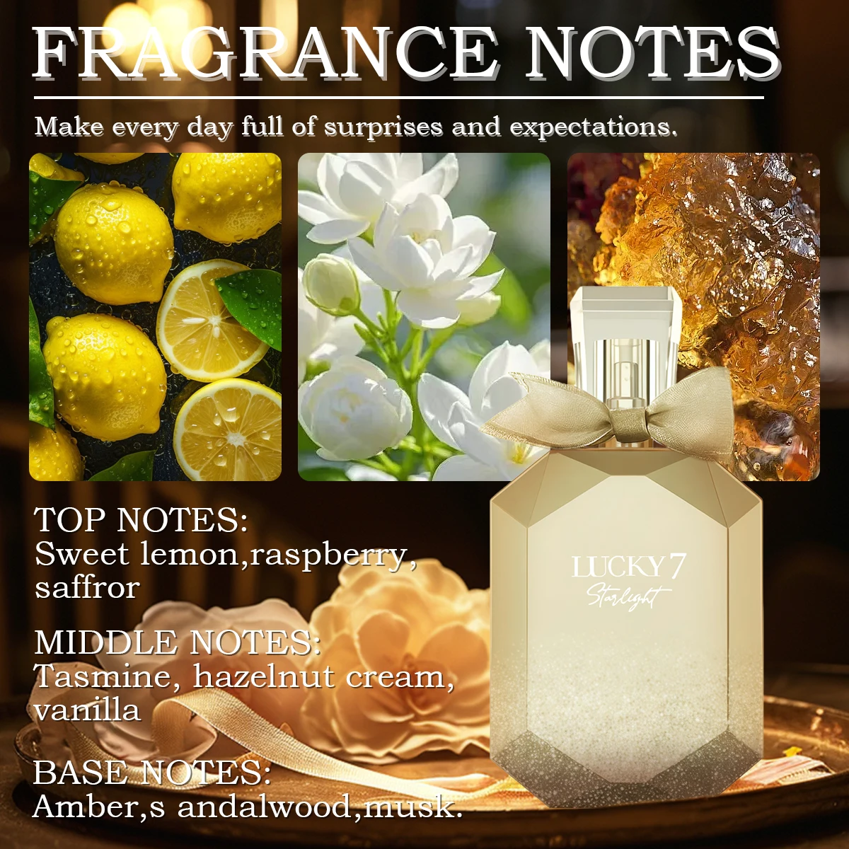 Shine bright with Lucky 7 Starlight Eau de Perfume . This luminous fragrance combines fruity top notes with soft florals and a warm amber base, creating an irresistible and radiant scent. Perfect for day-to-night wear, its long-lasting formula ensures you stay refreshed and elegant. Encased in a sleek bottle, Starlight is a dazzling addition to your perfume collection.