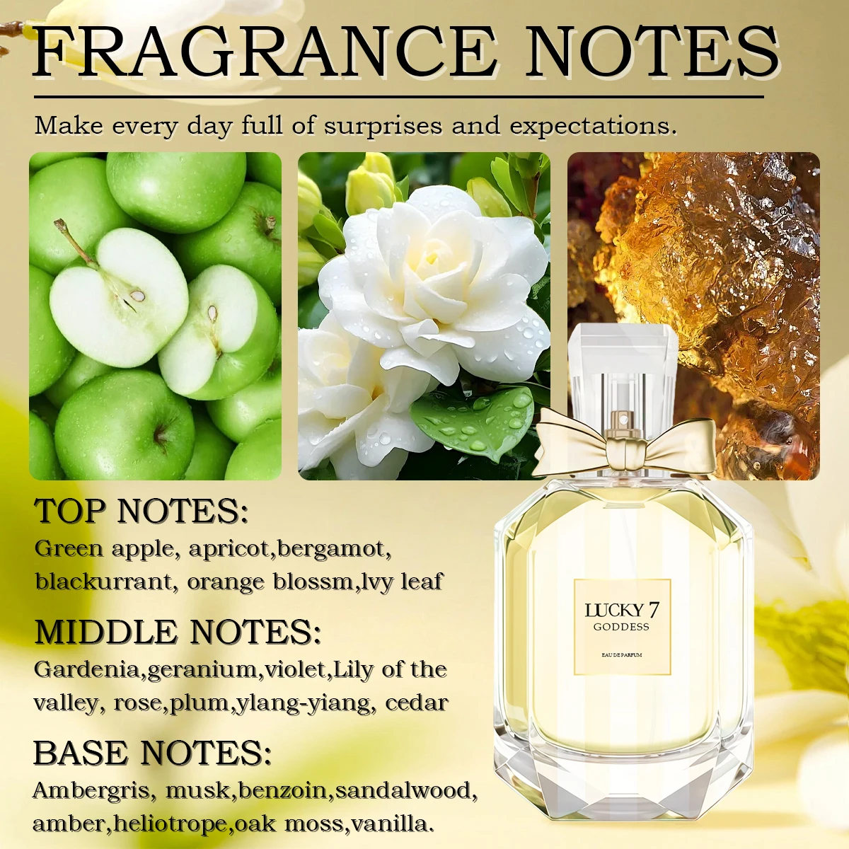 Embrace your inner radiance with Lucky 7 Goddess Eau de Parfum. This enchanting fragrance blends floral notes with soft undertones of musk and amber, creating a sensual and empowering aura. Perfect for day or night, its long-lasting formula ensures you stay refreshed and confident throughout the day. Encased in an elegant bottle, this perfume is a luxurious addition to your fragrance collection.