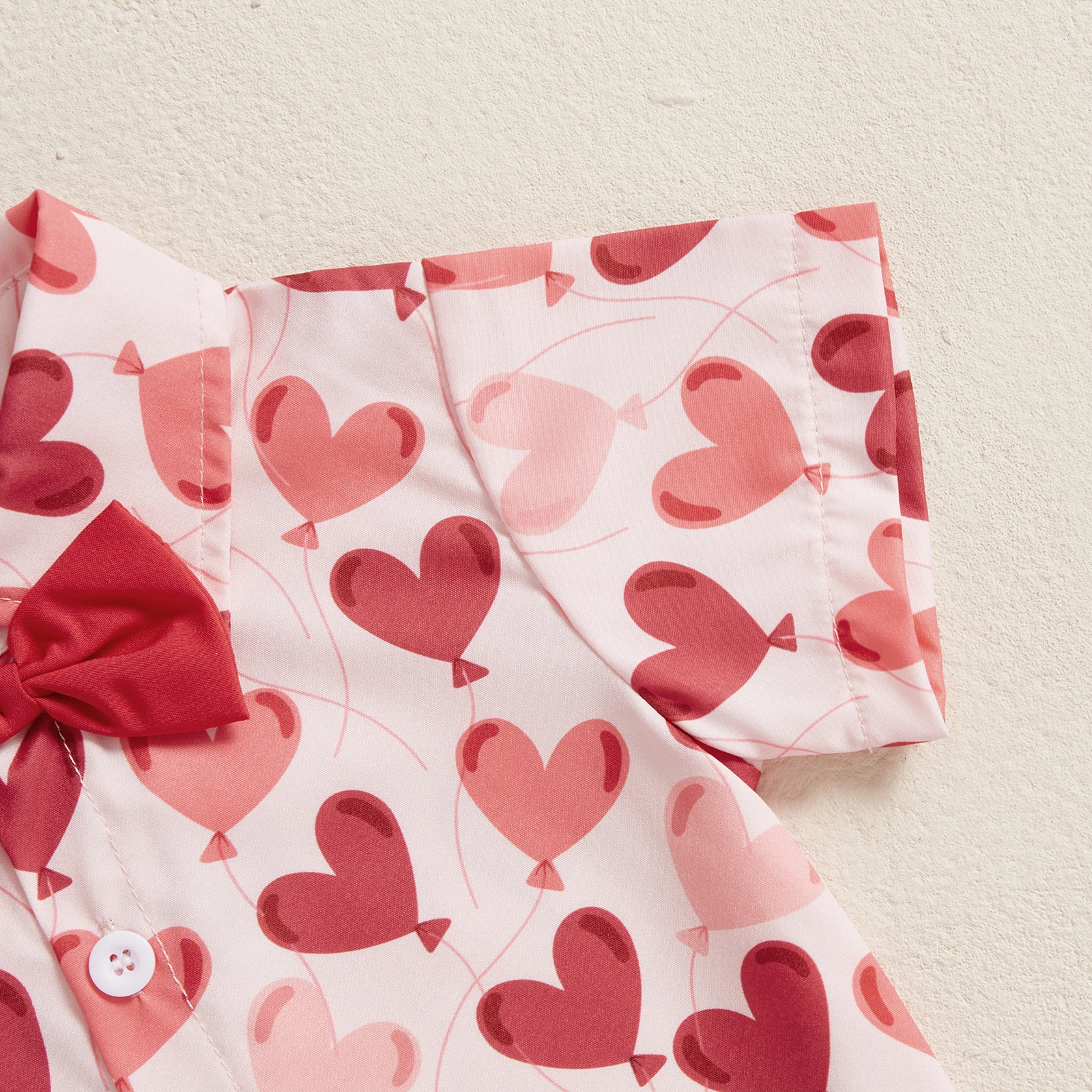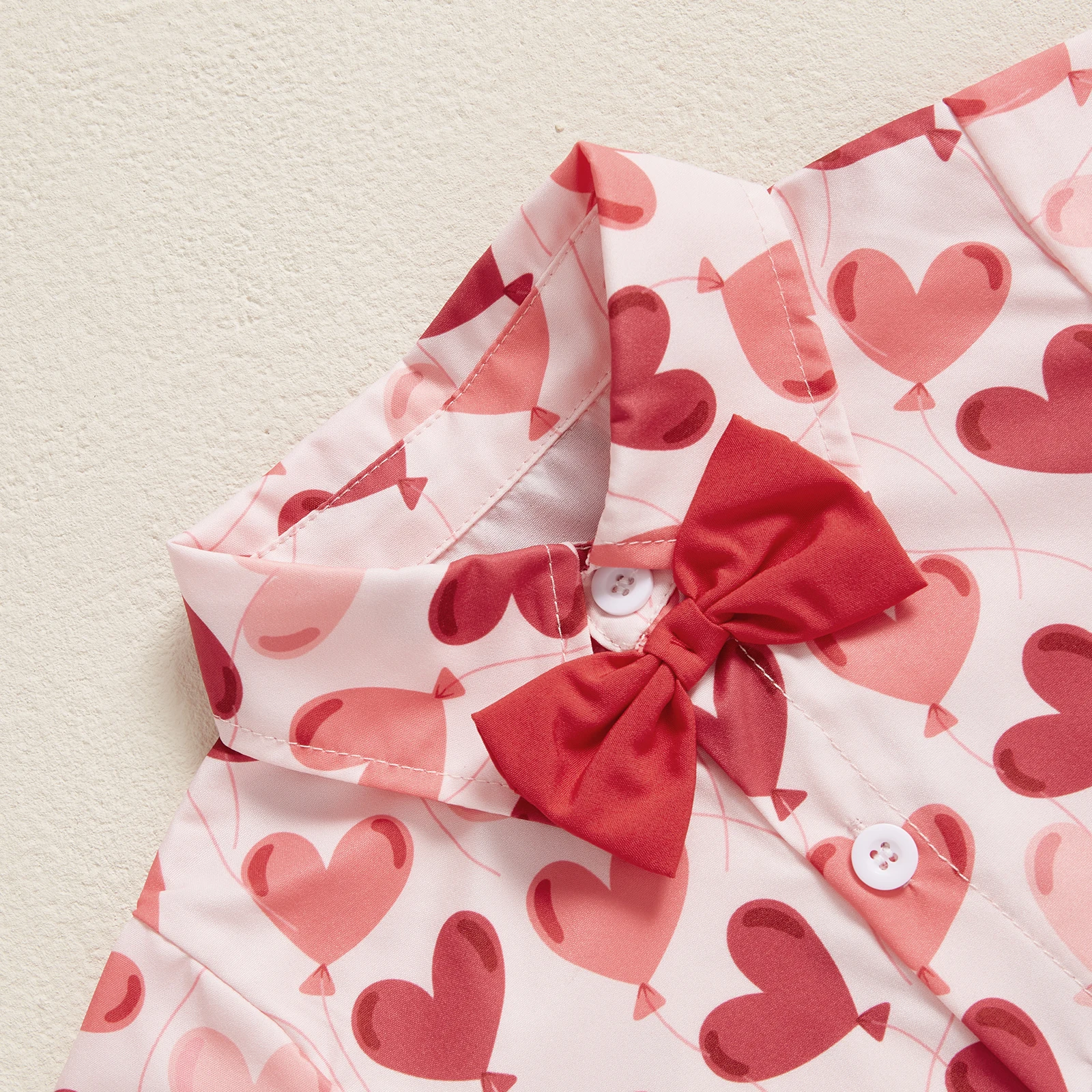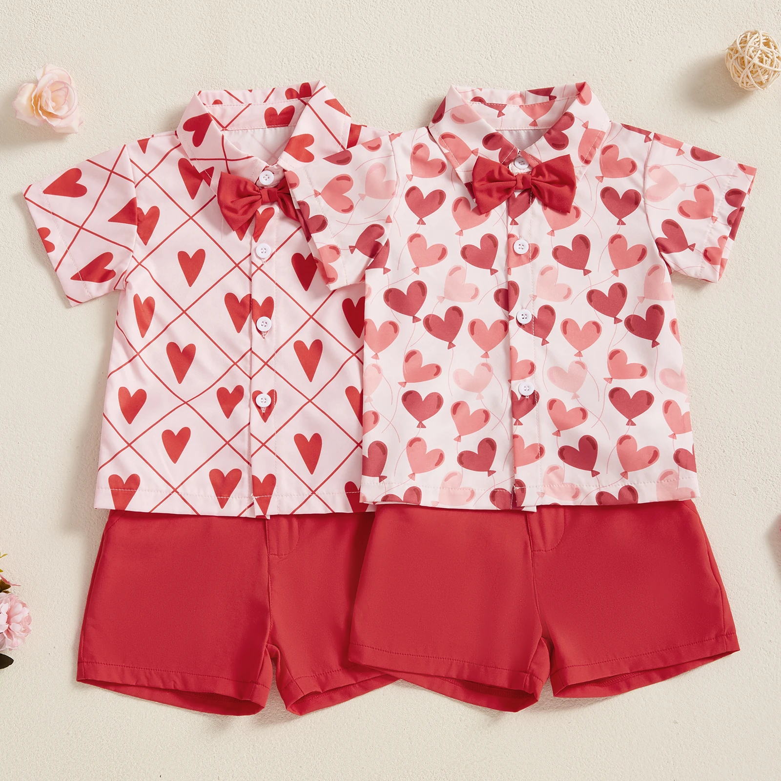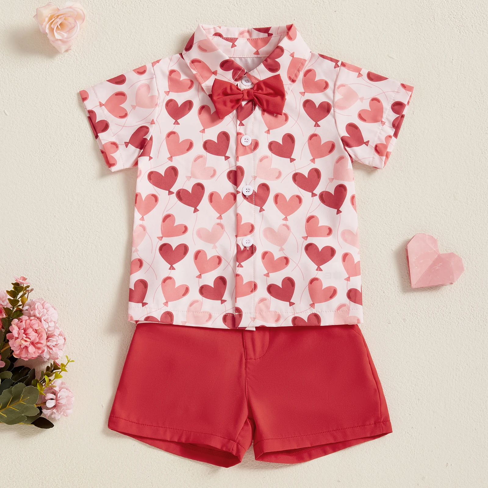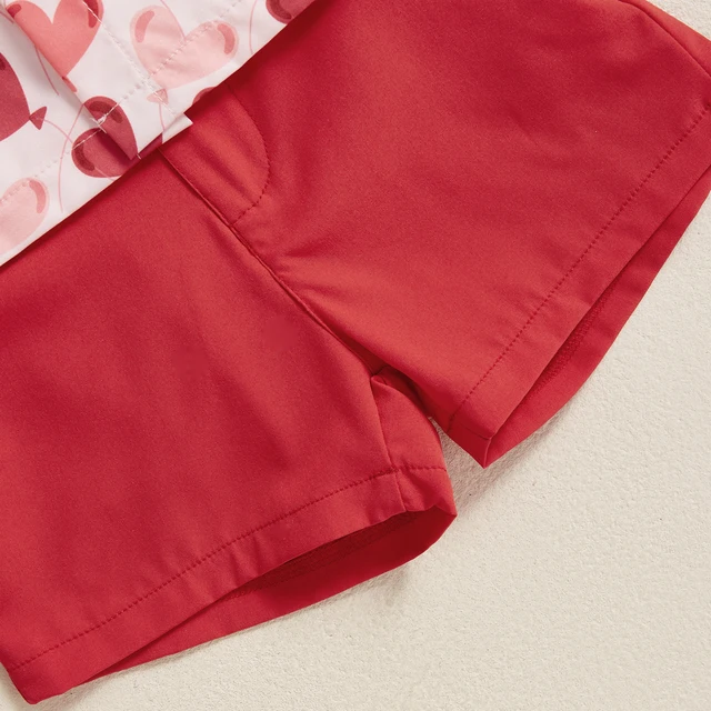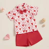 Toddler Boy Valentine’s Day Set Heart Print Short Sleeve Button-up Bow Tie Shirt Pockets Shorts