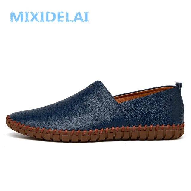 MIXIDELAI Genuine Cow Leather Mens Loafers Fashion Handmade Moccasins Soft Leather Blue Slip On Men's Boat Shoe PLUS SIZE 38~47