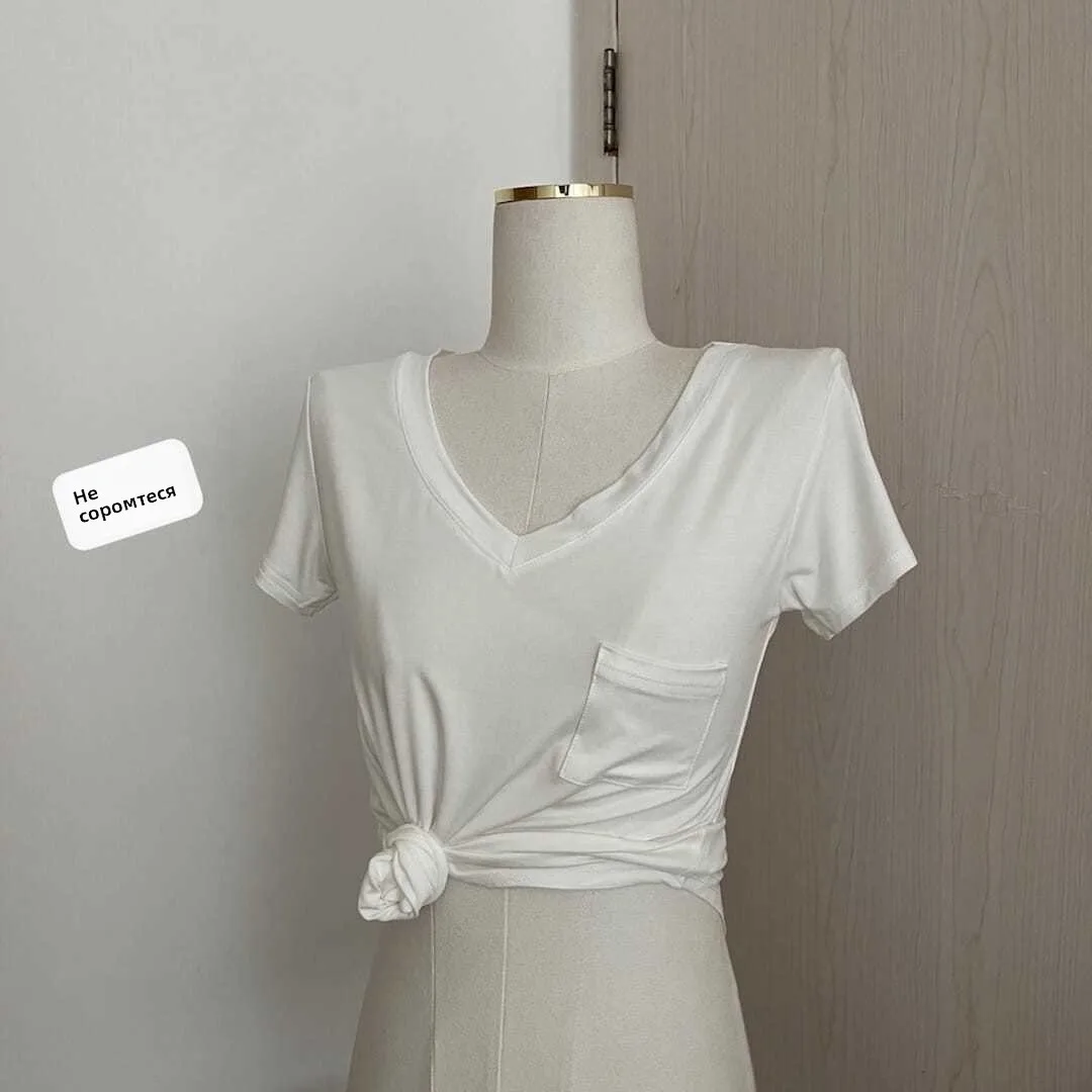 The V-neck design adds a touch of elegance and femininity, making it a versatile piece for various occasions.