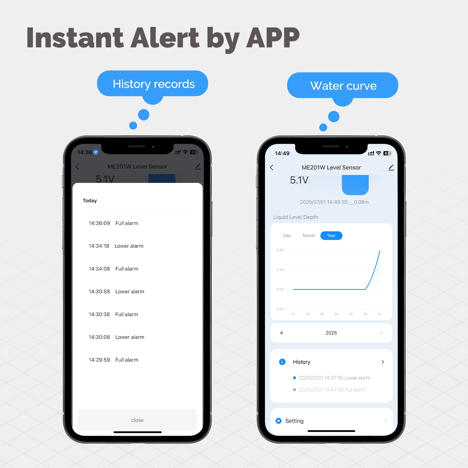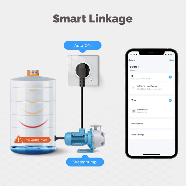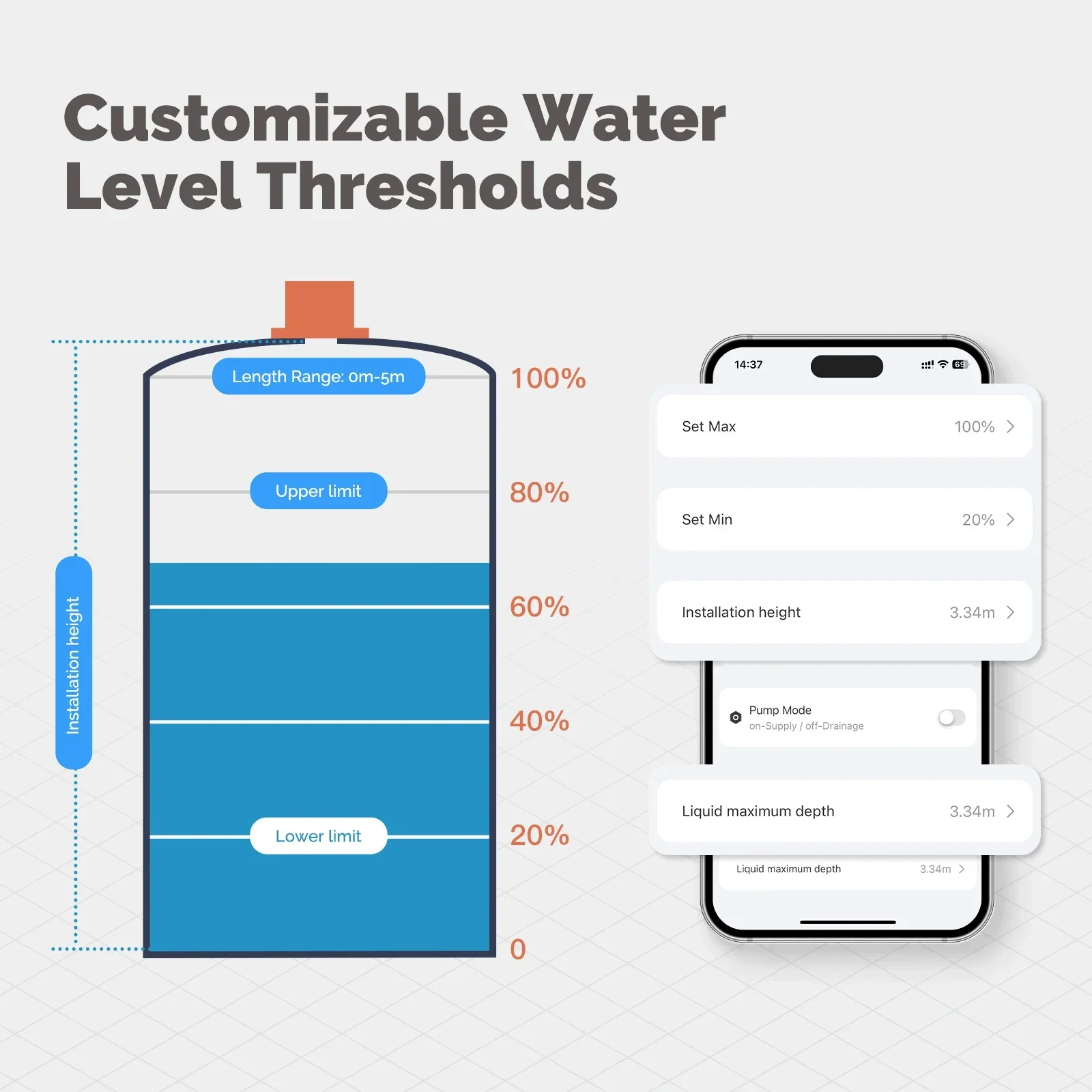 Set upper and lower water level thresholds for smarter overflow and dry-run prevention with App alert.