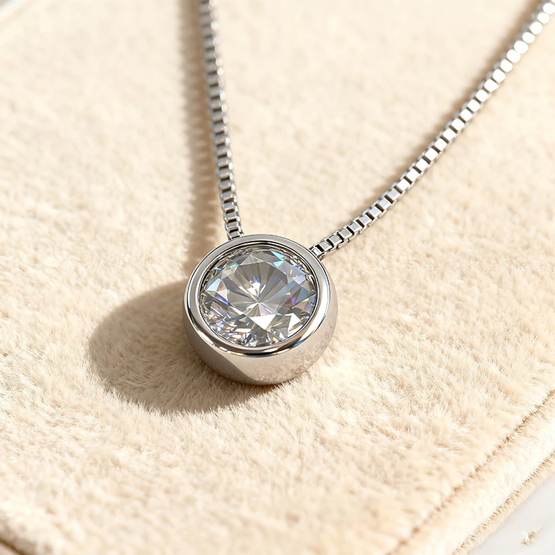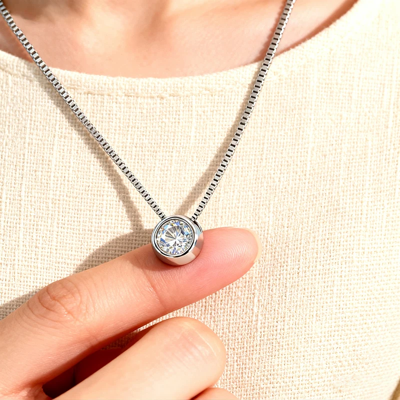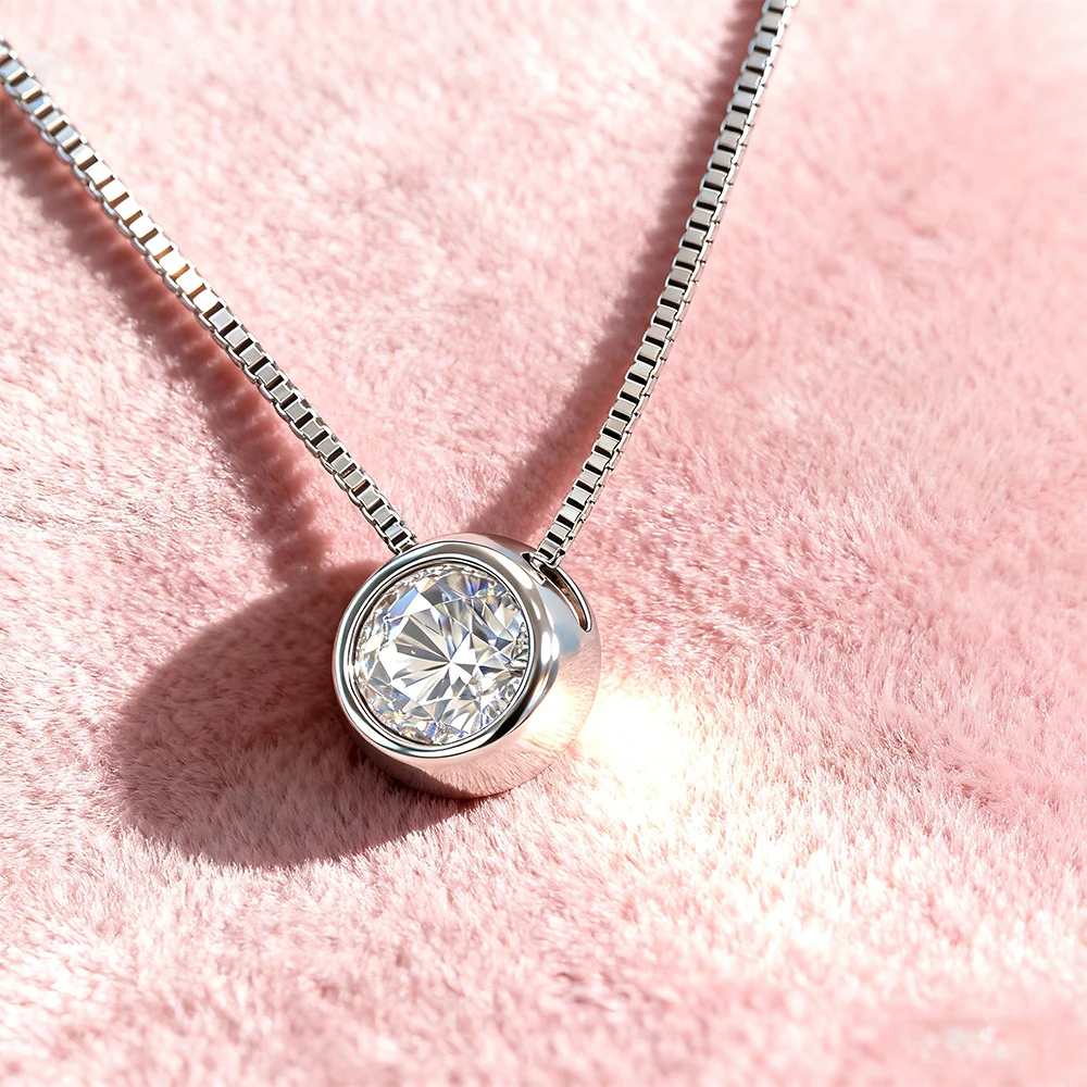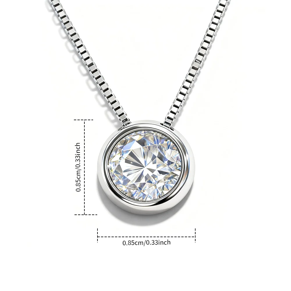 VIRTUOSIC BRILLIANCE: A timeless pendant featuring a luminous Round Cut Moissanite in a secure bezel setting, suspended from an 18″ 0.75mm hypoallergenic cable chain. The precision-cut round shape maximizes exceptional 360° fire and scintillation, creating intense sparkle from every angle, while its universal elegance complements all styles. With 18K gold plating for lasting luster, its hair-friendly silhouette offers all-day comfort during sports, travel, or daily wear.