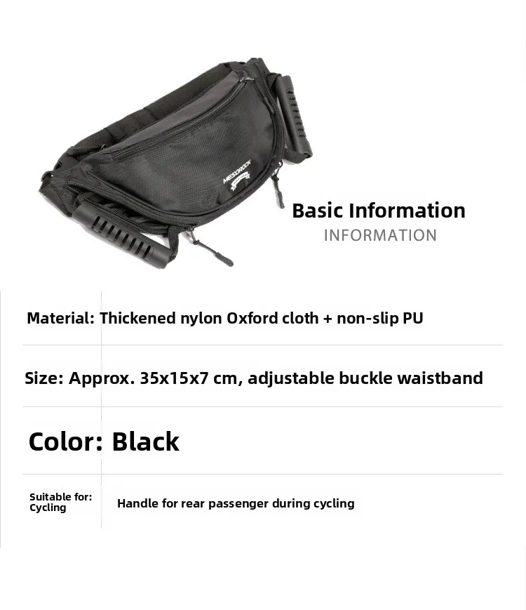 This waist bag handle serves as a safety feature, providing a secure grip for the rider’s companion.