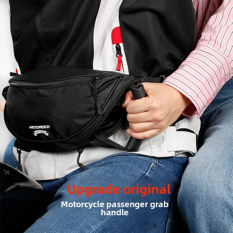This waist bag handle serves as a safety feature, providing a secure grip for the rider’s companion.