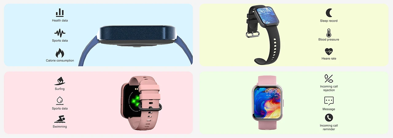 Basic features: pedometer, sleep, heart rate, workout, weather, camera control, music control, torch, theatre mode, stopwatch, alarm, timer, sedentary reminder, breathing training, messages, brightness adjustment, mute, QR code
