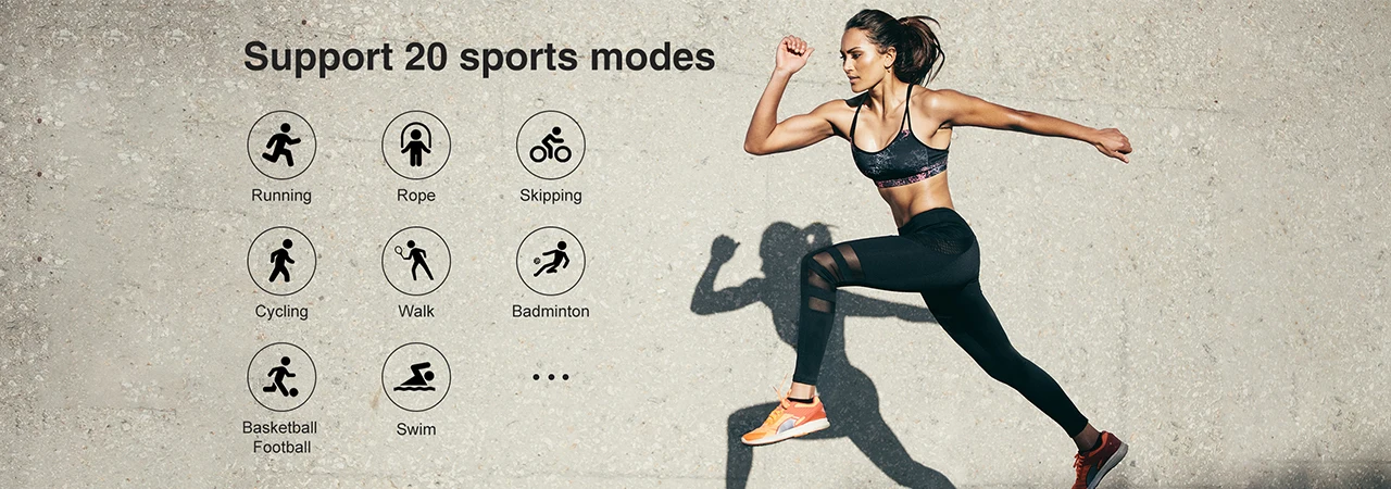 C17 fitness tracker has 20 sport mode for your choose: Walking,running,cycling,badminton,basketball,football,swimming,hiking,tennis,rugby,golf,baseball,elliptical,freely training,rowing machine,cross country running,skiing,bowling,dumbbells/sit-ups.