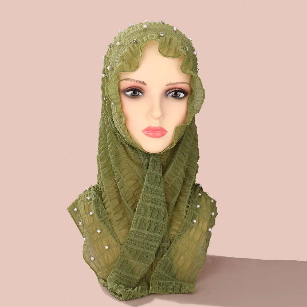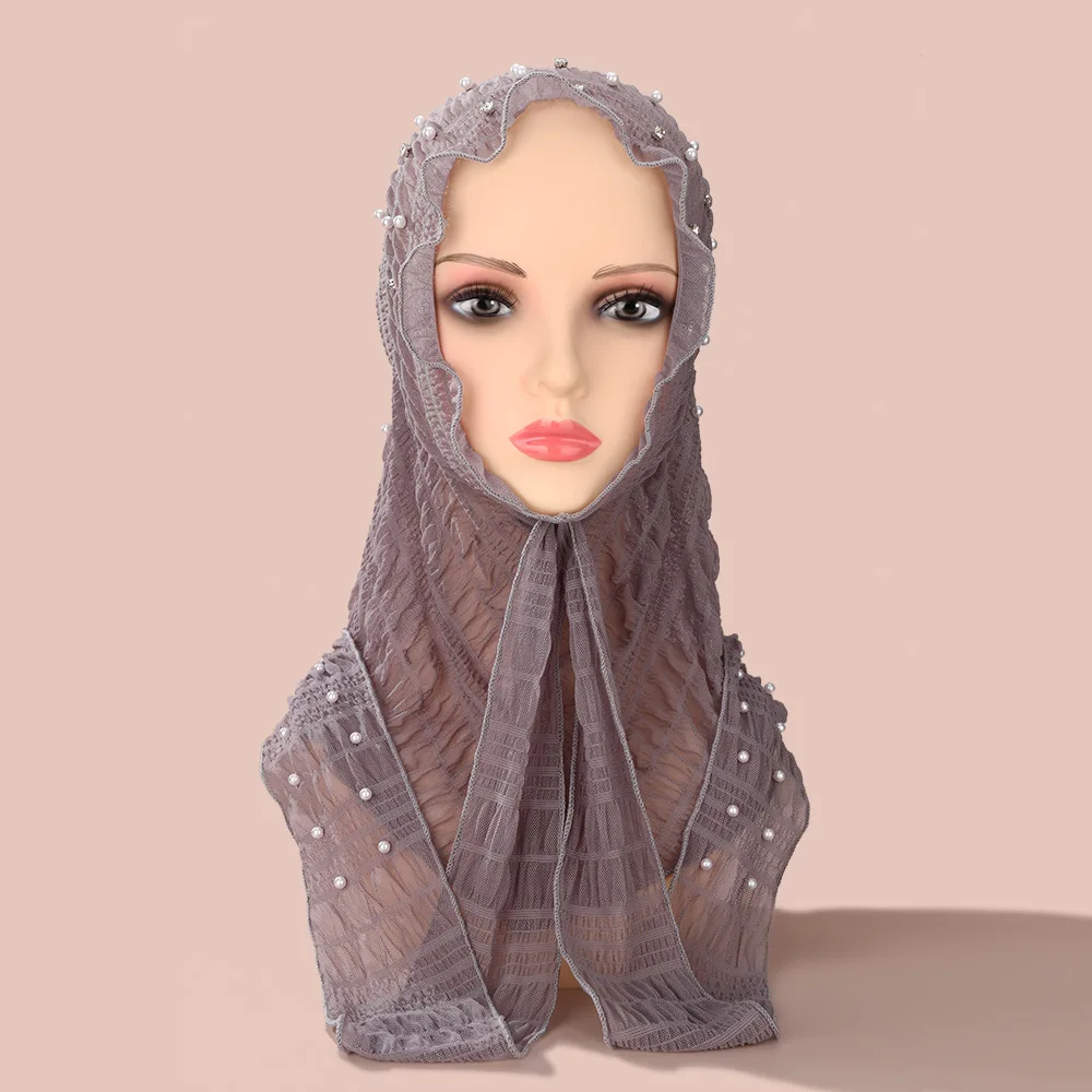 Muslim Hijab Solid Color Lace Mesh Rhinestone Arab Women Beaded Soft and Easy to Wear Lace Up Head Wrap