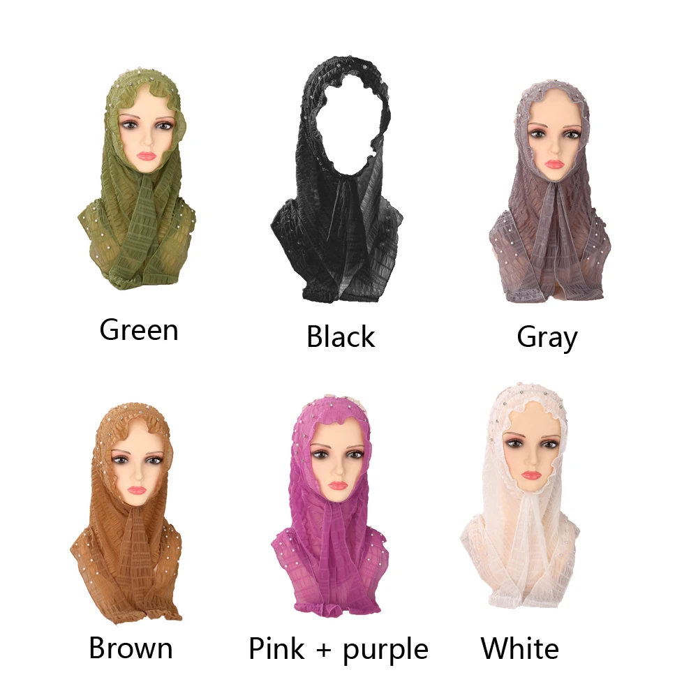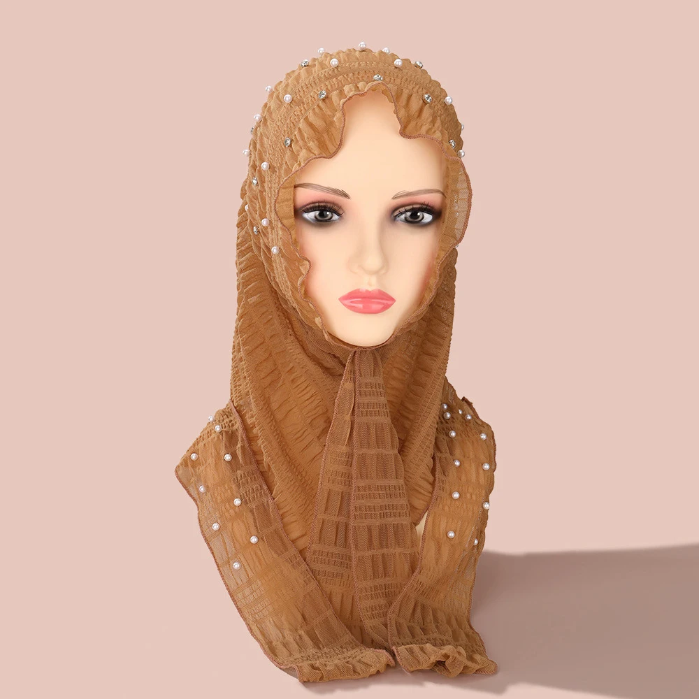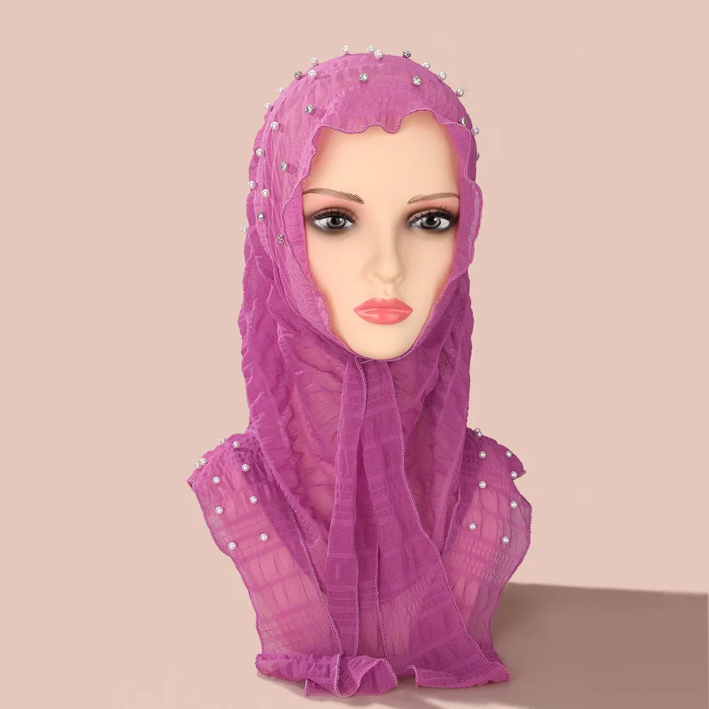 Muslim Hijab Solid Color Lace Mesh Rhinestone Arab Women Beaded Soft and Easy to Wear Lace Up Head Wrap Scarf Shawl Pullover Hat
