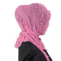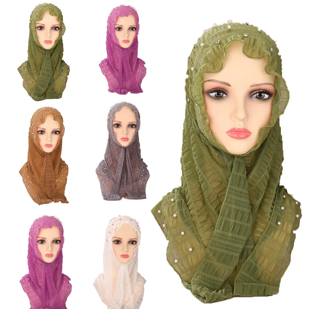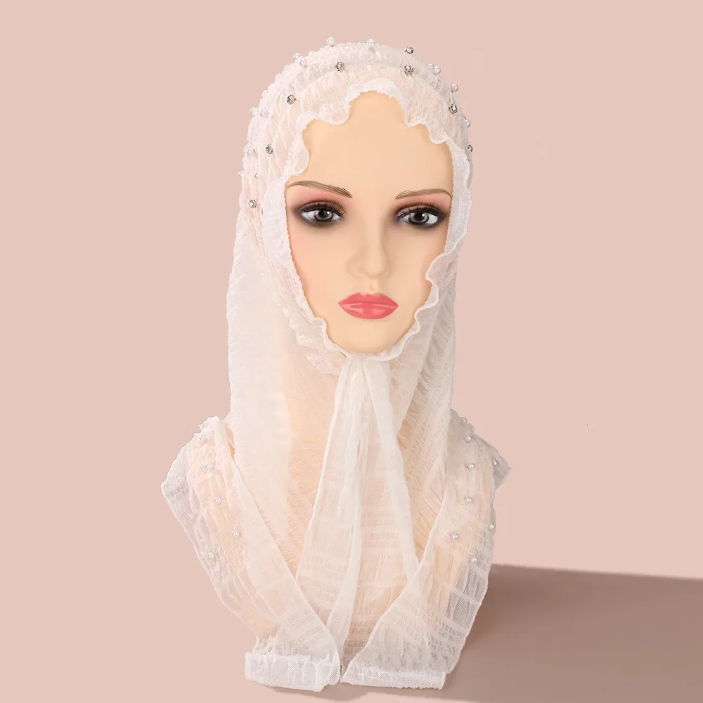 Muslim Hijab Solid Color Lace Mesh Rhinestone Arab Women Beaded Soft and Easy to Wear Lace Up Head Wrap Scarf Shawl Pullover Hat