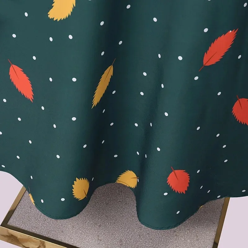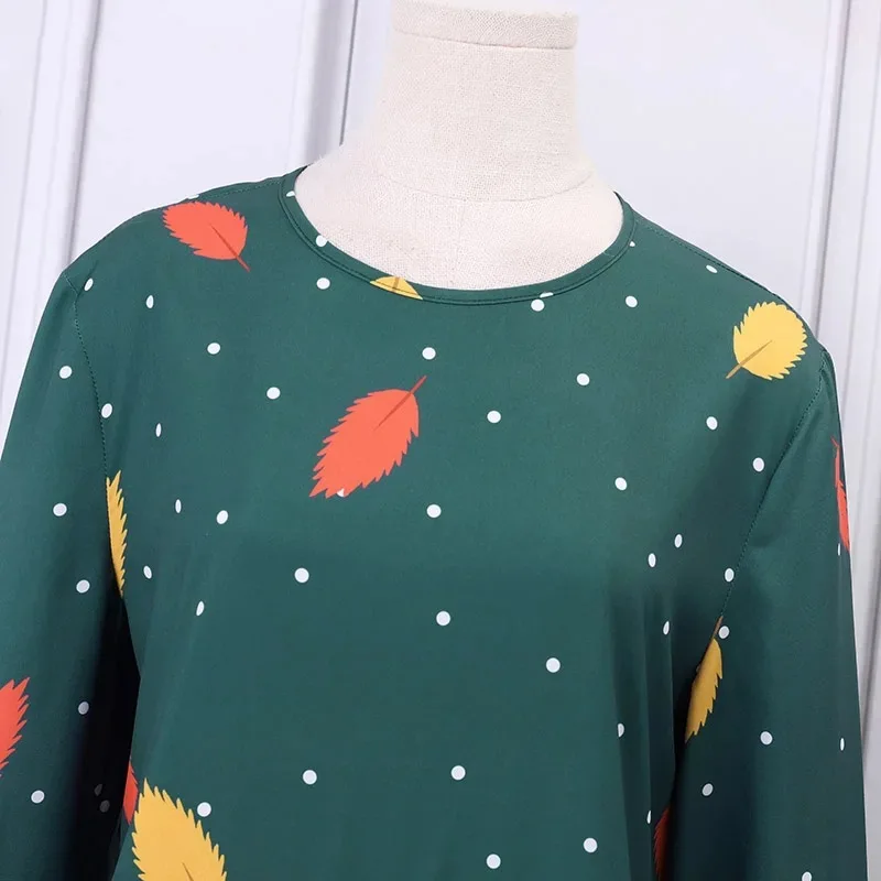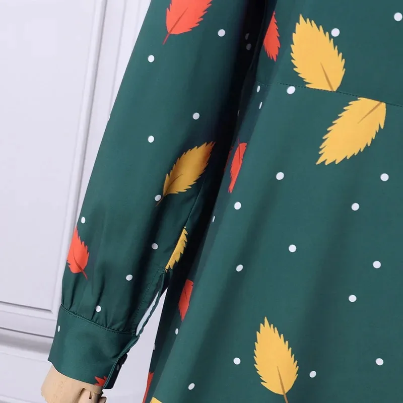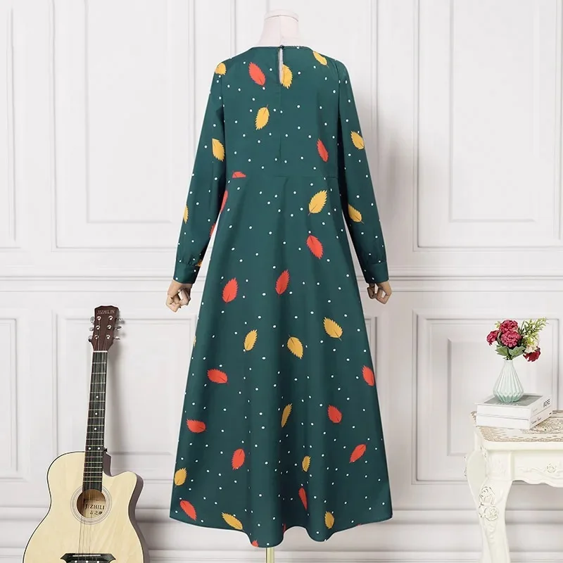 Muslim Leaf Pattern Long Sleeve Dress for Women Casual Bohemian Polka Dot Print Holiday Muslim Dress