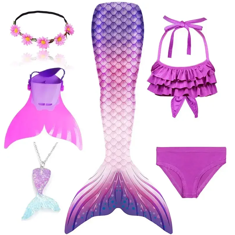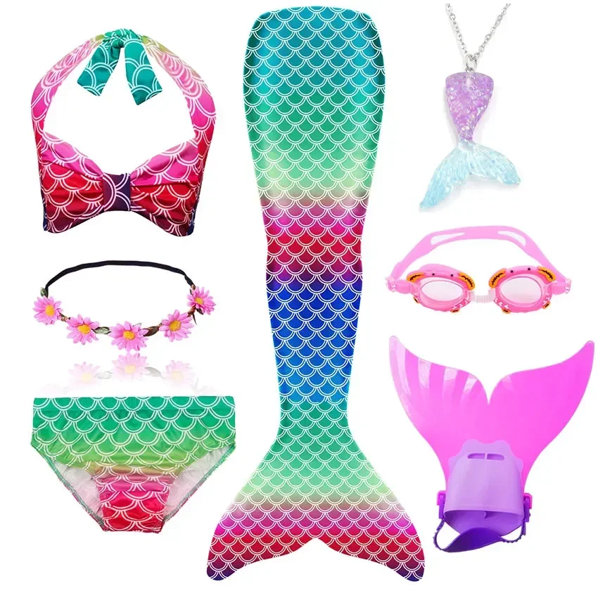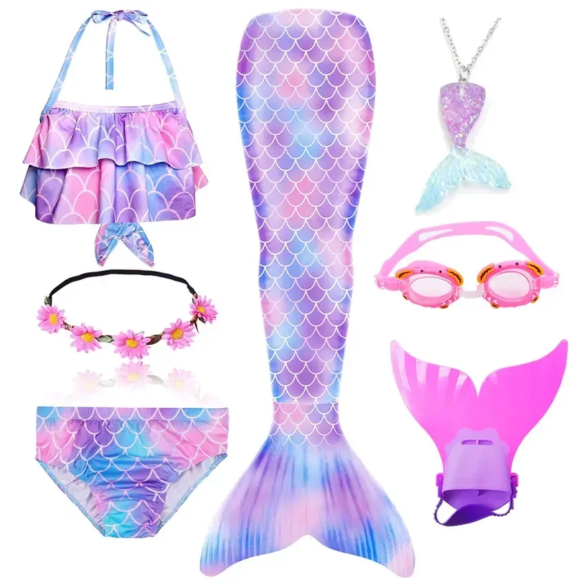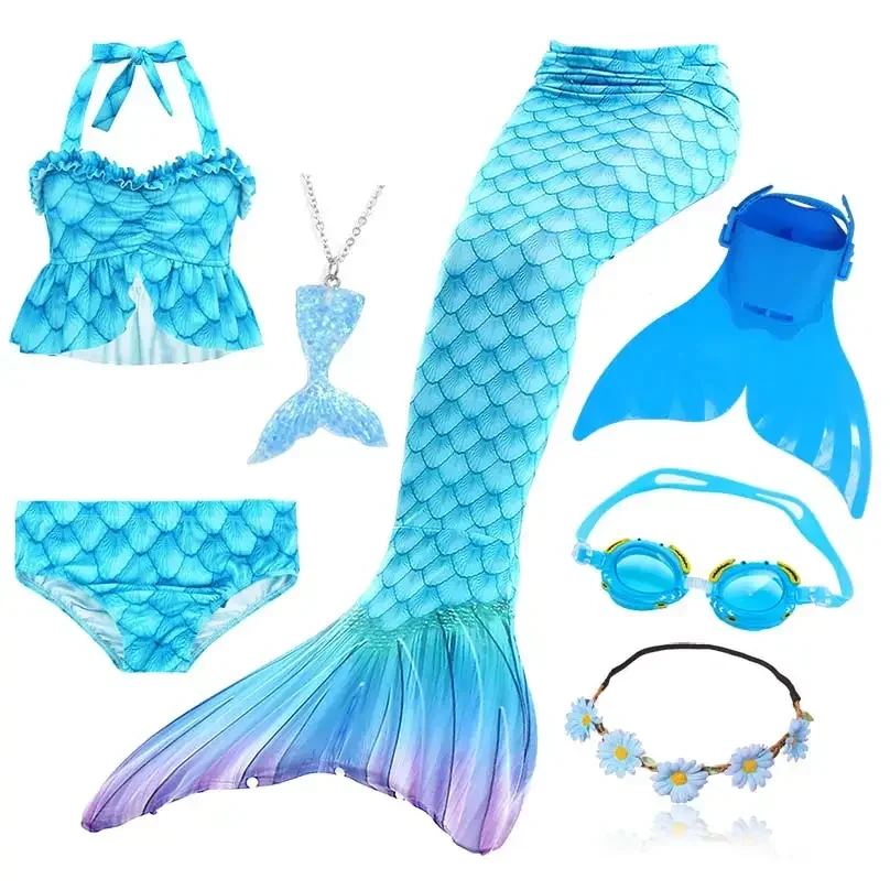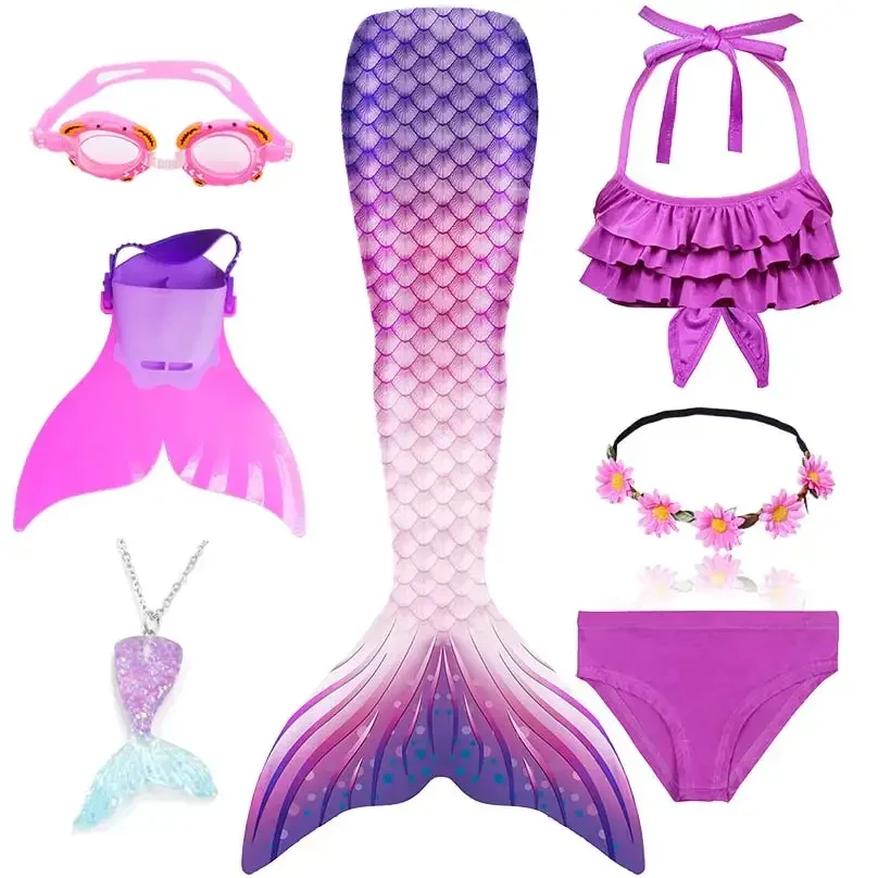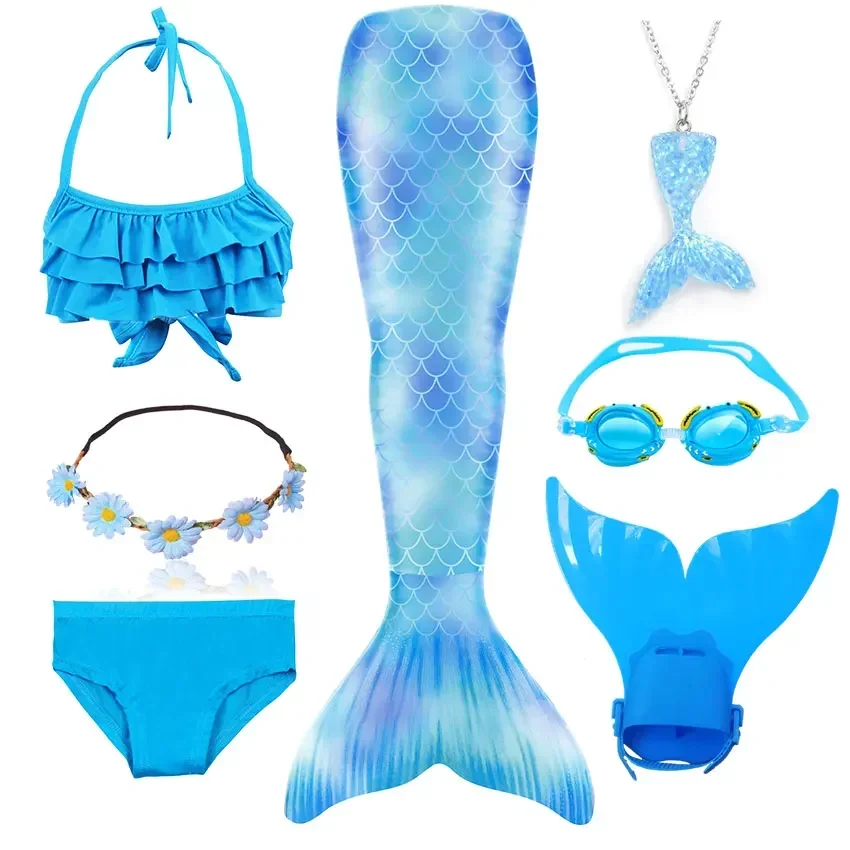 • Package 1: 1 * Mermaid Tail 1 * Tops 1 * Shorts 1 * Monofin 1 * Garland 1 * Goggle 1 * Mermaid Necklace (Totally 7 things/Set)