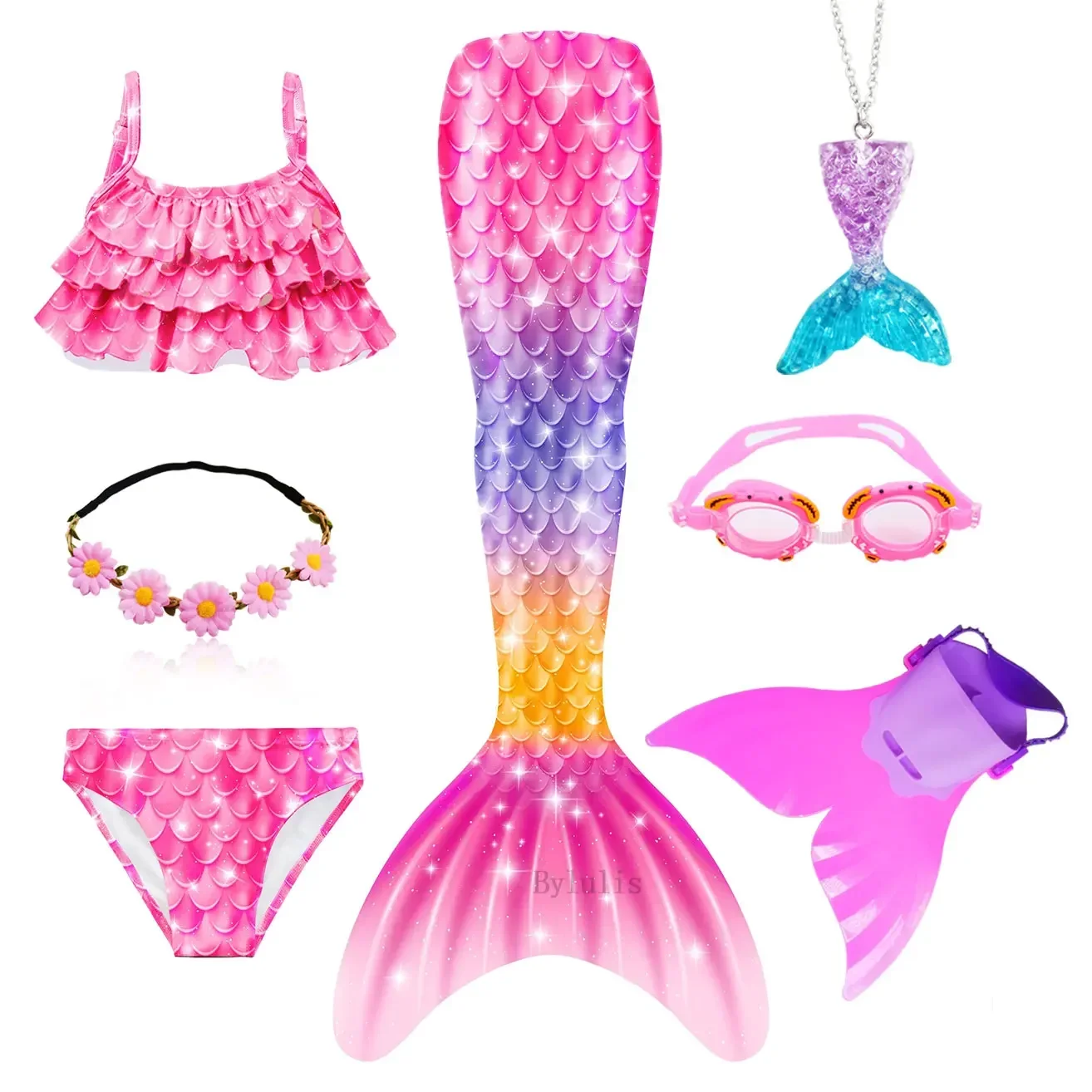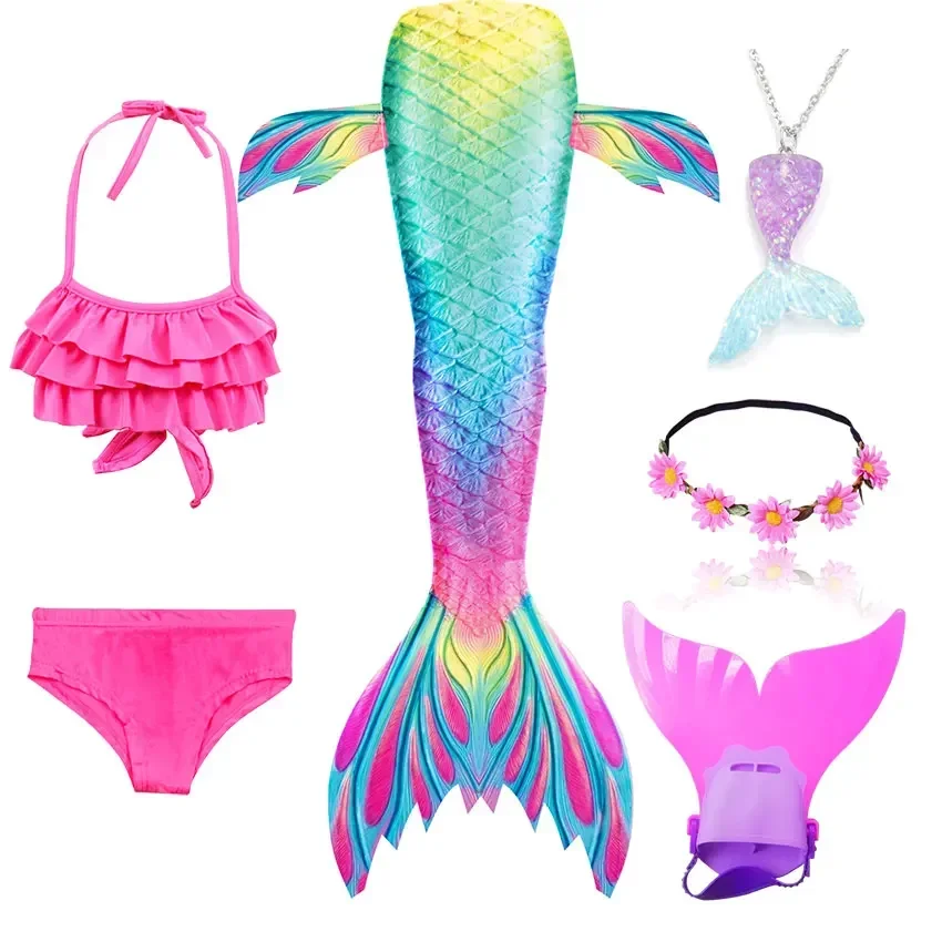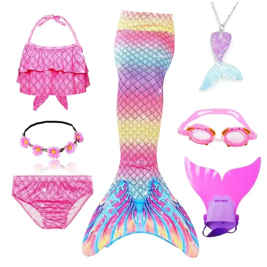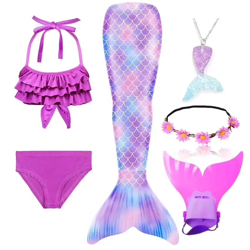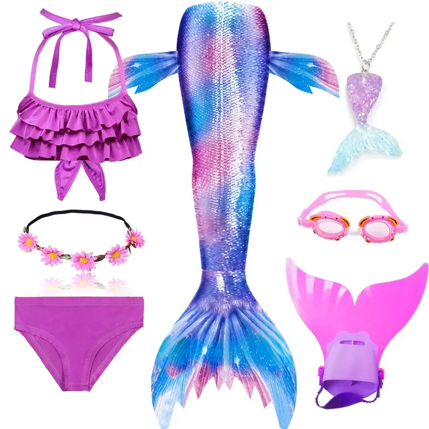 • Package 1: 1 * Mermaid Tail 1 * Tops 1 * Shorts 1 * Monofin 1 * Garland 1 * Goggle 1 * Mermaid Necklace (Totally 7 things/Set)