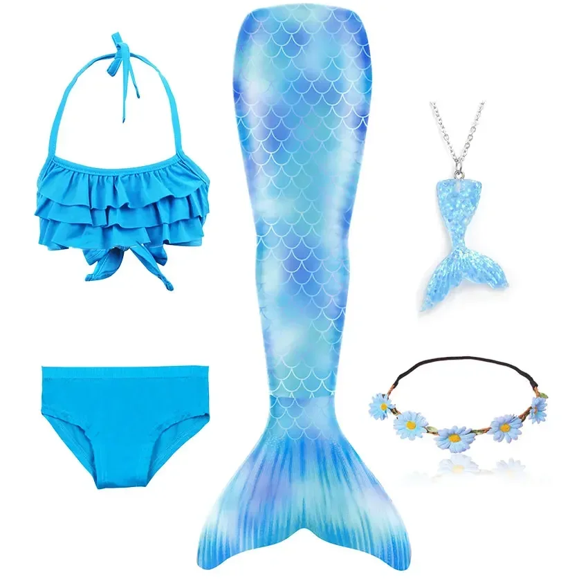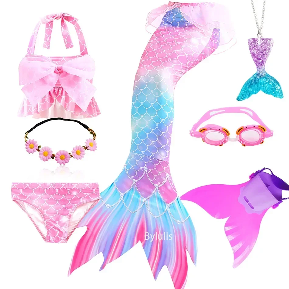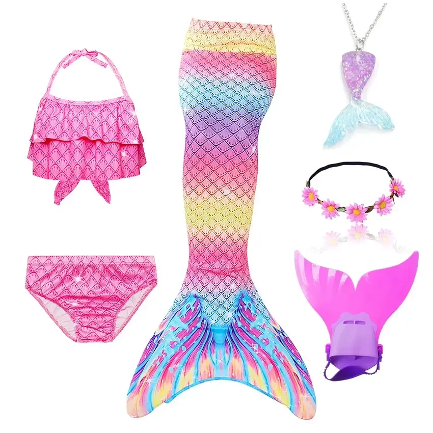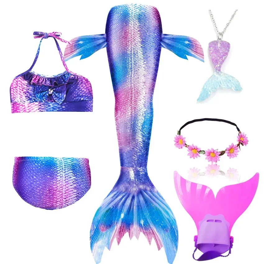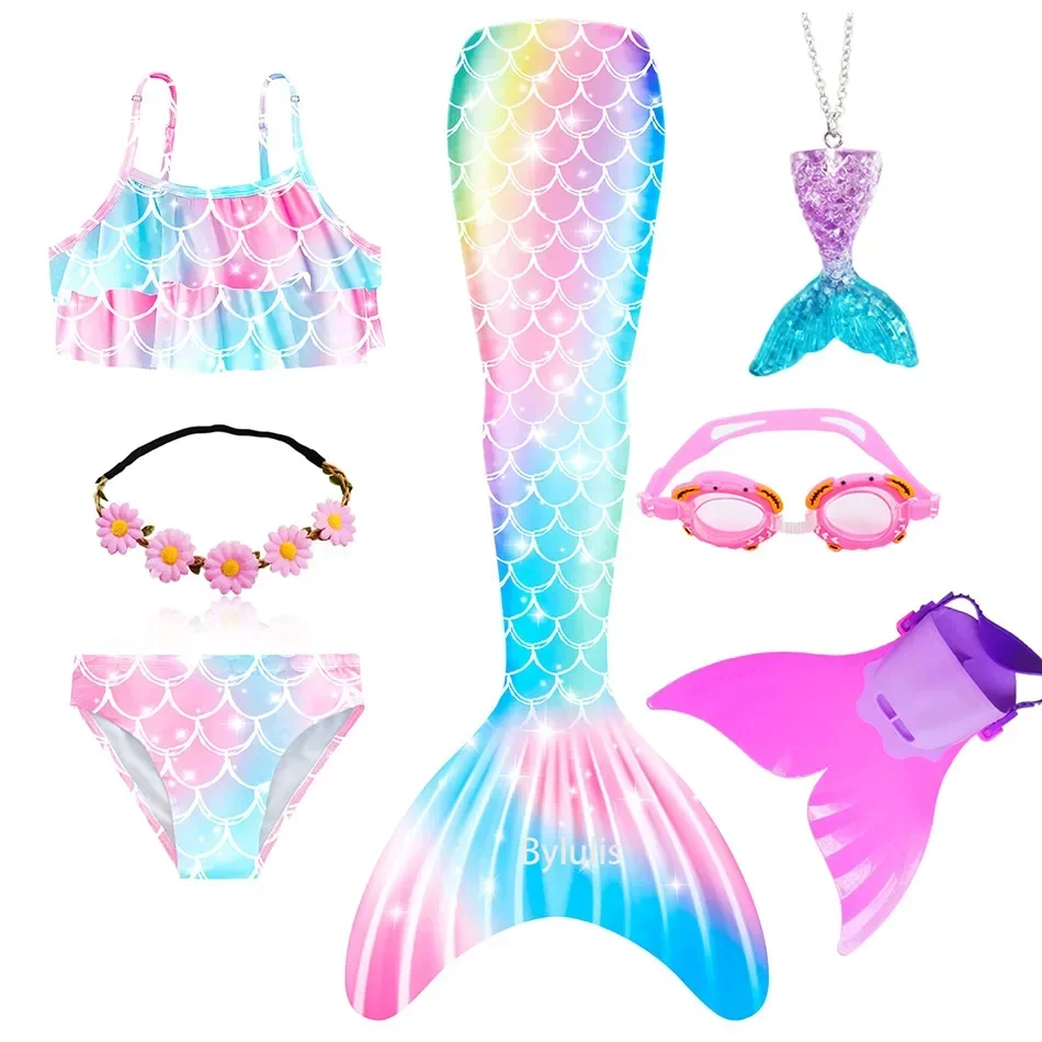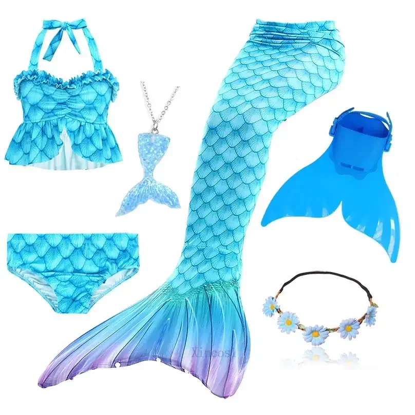 • Package 1: 1 * Mermaid Tail 1 * Tops 1 * Shorts 1 * Monofin 1 * Garland 1 * Goggle 1 * Mermaid Necklace (Totally 7 things/Set)