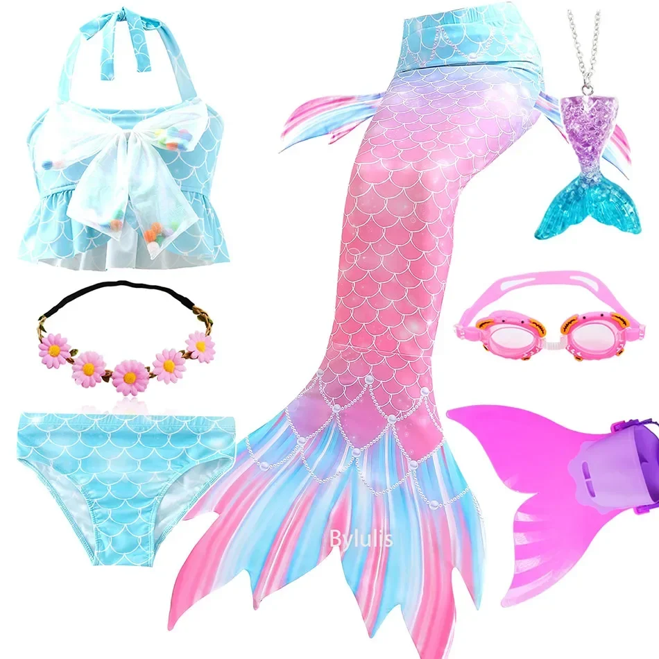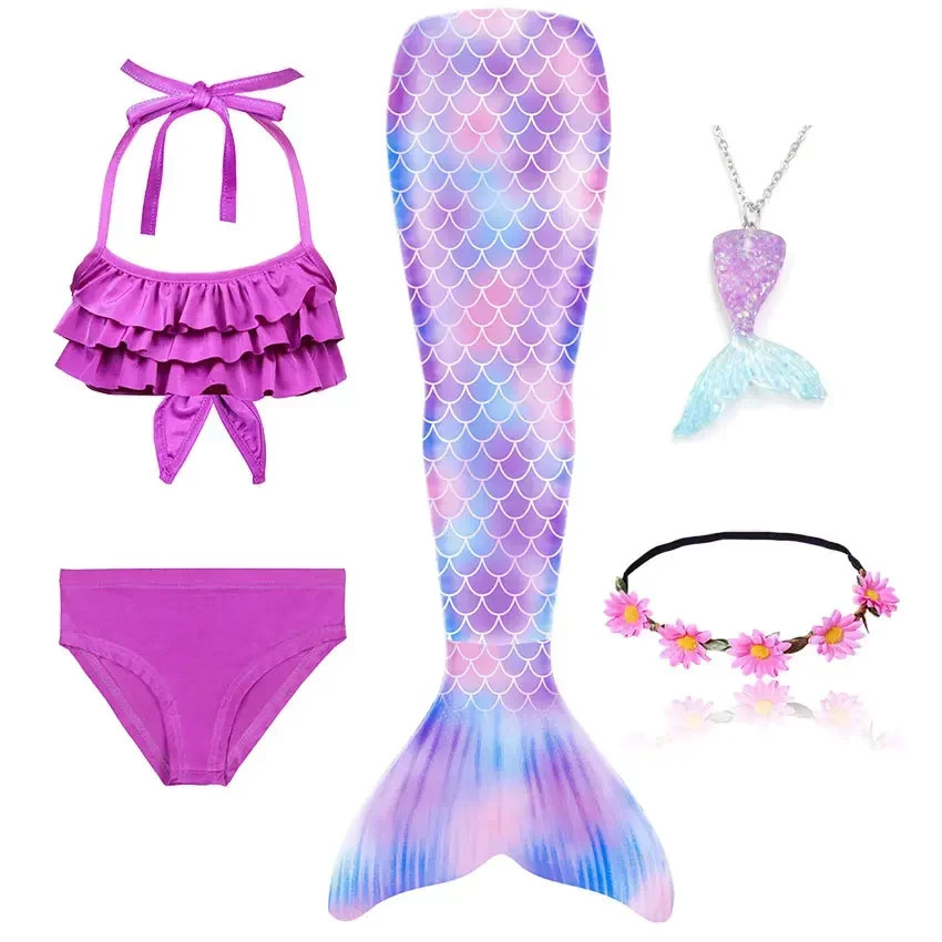 Girls Swimming Mermaid Tails Costume Cosplay Children the Little Mermaid Swimsuit Bikini Set for Kids with Monofin Garland