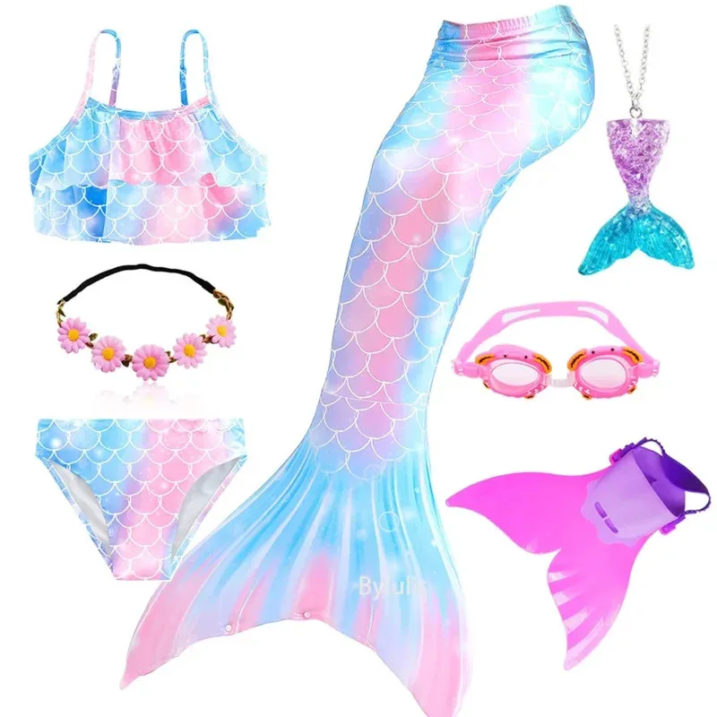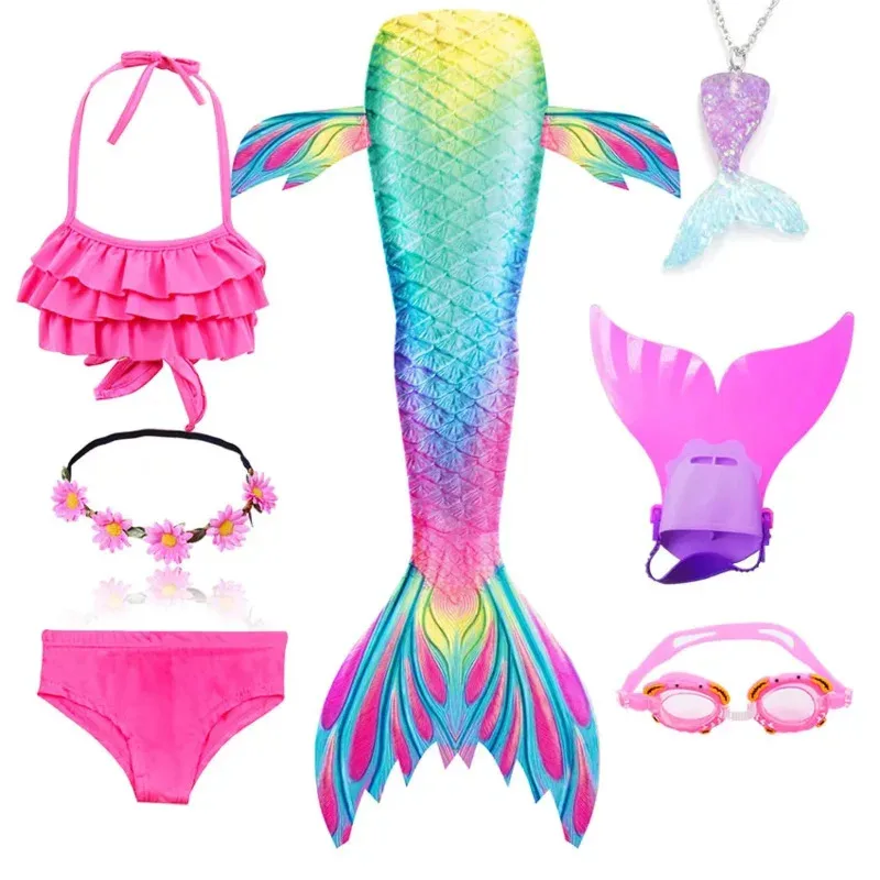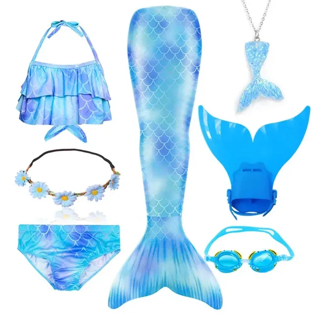 • Package 1: 1 * Mermaid Tail 1 * Tops 1 * Shorts 1 * Monofin 1 * Garland 1 * Goggle 1 * Mermaid Necklace (Totally 7 things/Set)