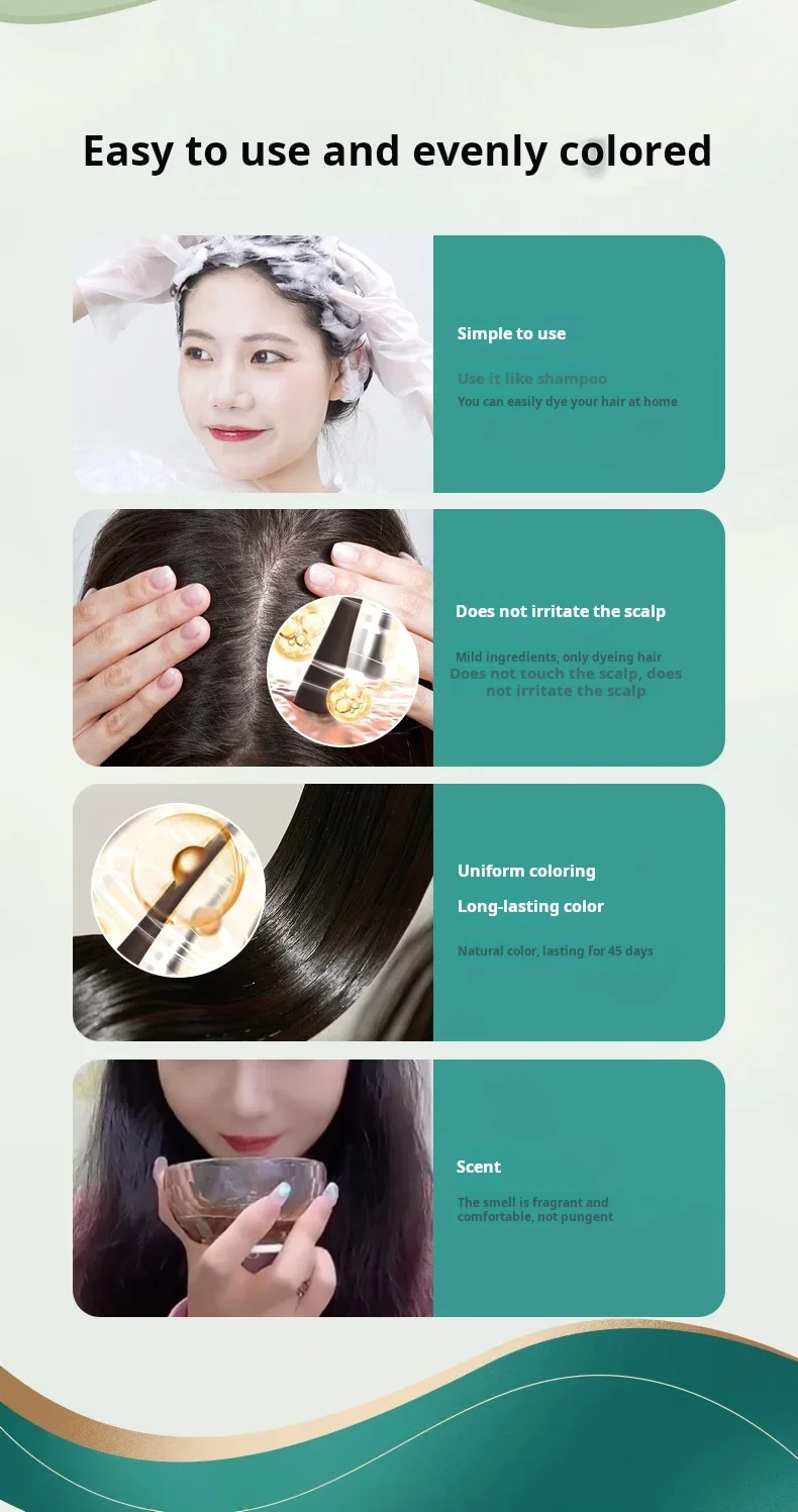 1. Plant bubble hair dye shampoo contains high-quality ingredients that nourish your hair while coloring it. It does not irritate the scalp and is gentle on your hair.only colors your hair naturally, but also repairs the scalp and nourishes the hair fiber from the inside out. The result is shiny, soft and smooth hair that is strong and healthy.