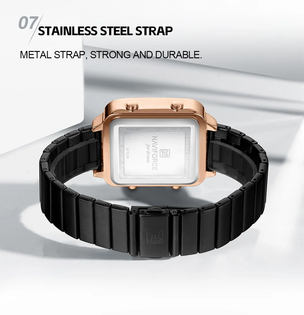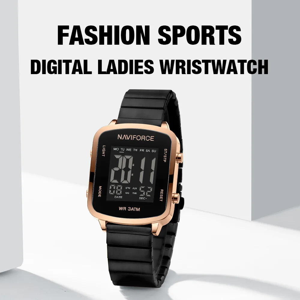 NAVIFORCE Fashion Sports Digital Women's Watch Stopwatch Timekeeping 3ATM Waterproof Luminous Stainless Steel Alarm Ladies'Cock