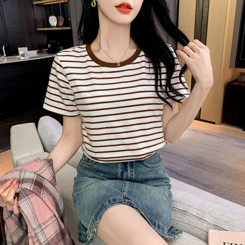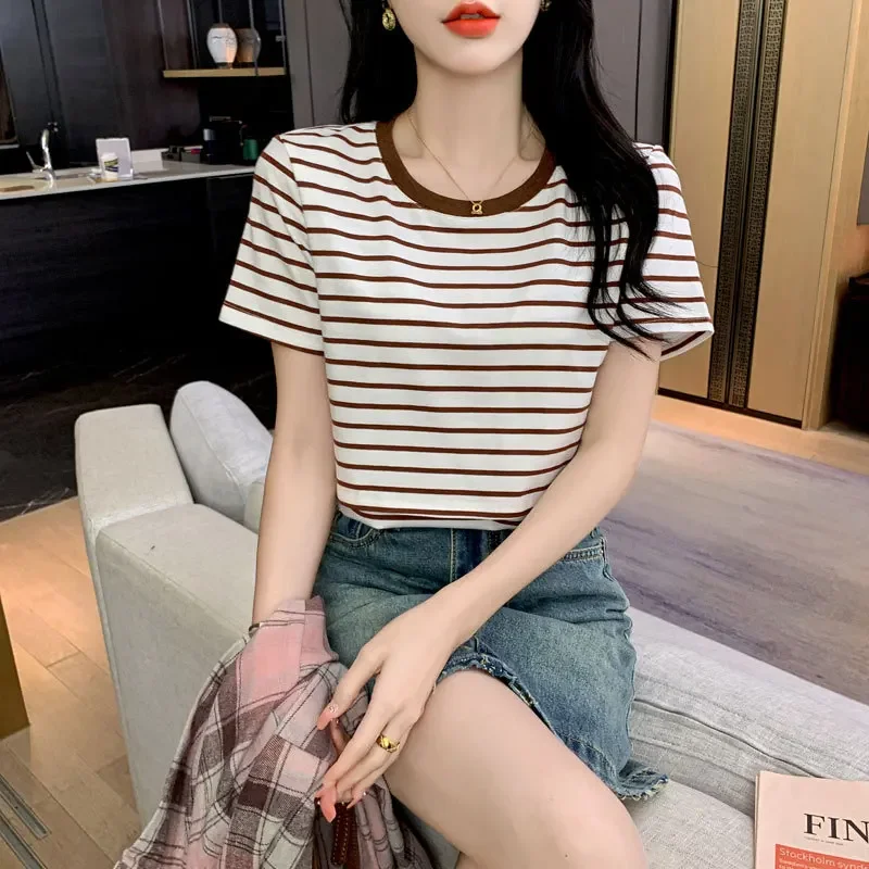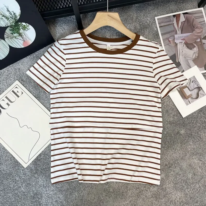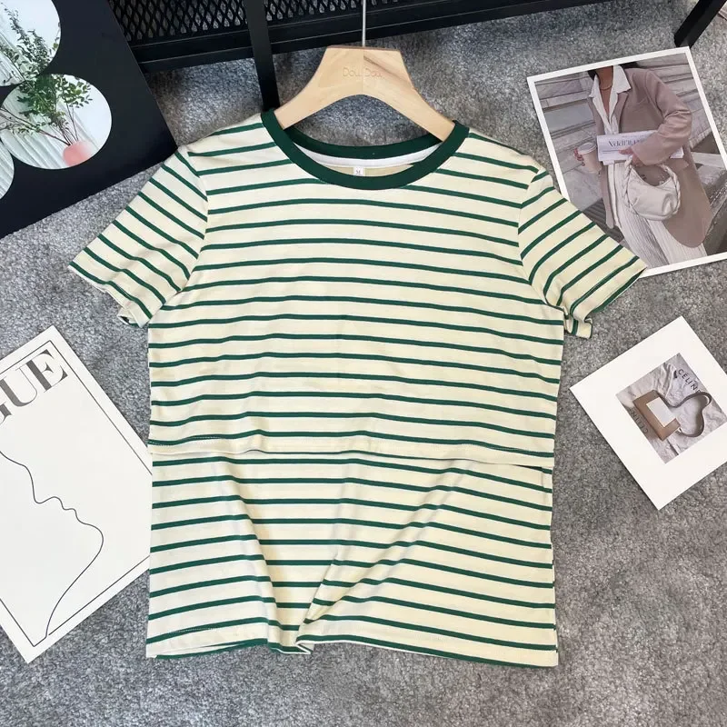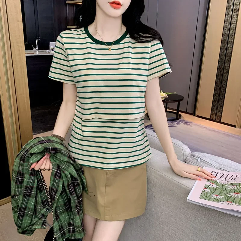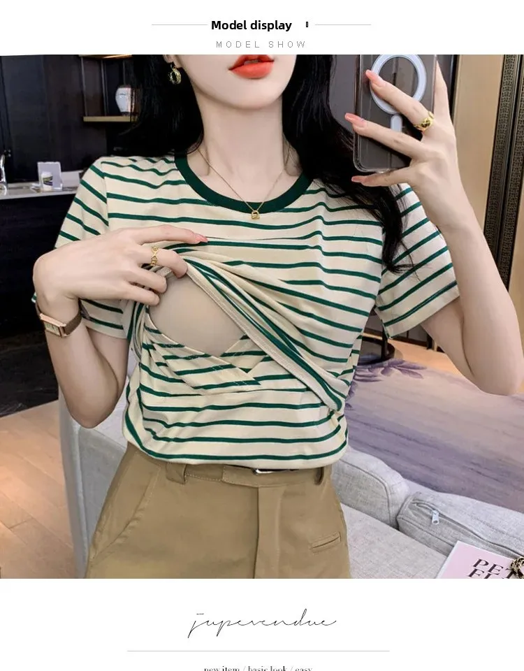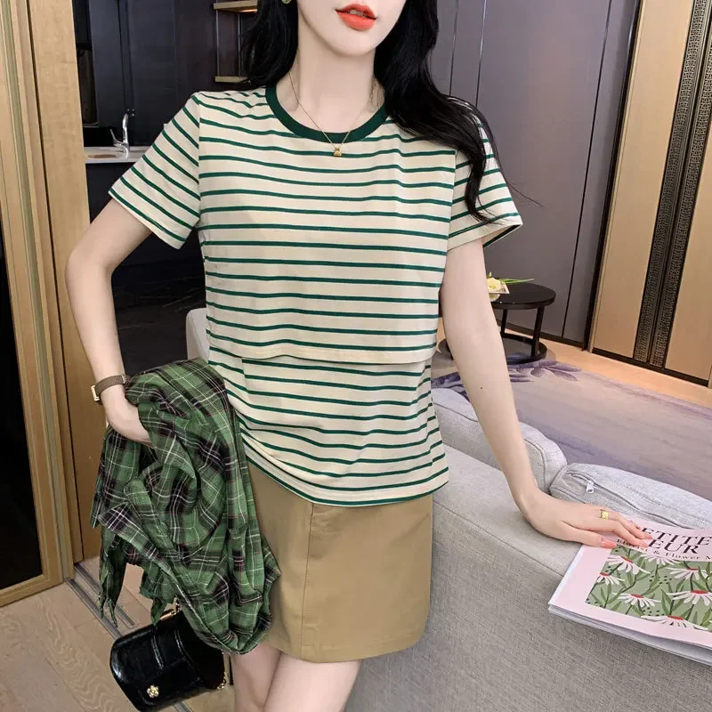 New 2025 Striped Nursing T-Shirt Soft Comfortable Summer Postpartum Mommy Feeding Top Base Shirt Maternity