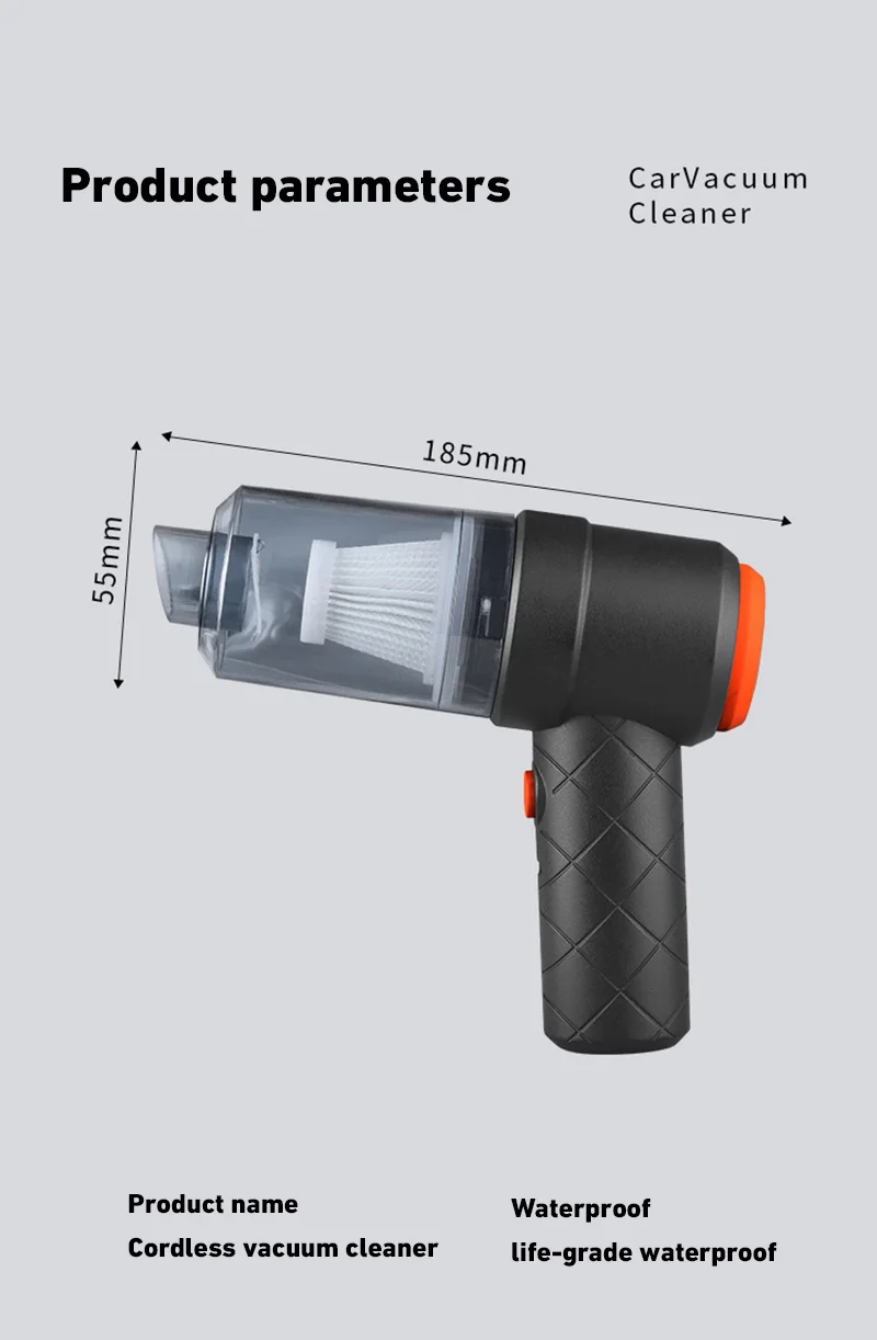 *High-power suction: The powerful motor generates 690000PA strong suction to suck away dust, hair, debris and other dirt in the car.
