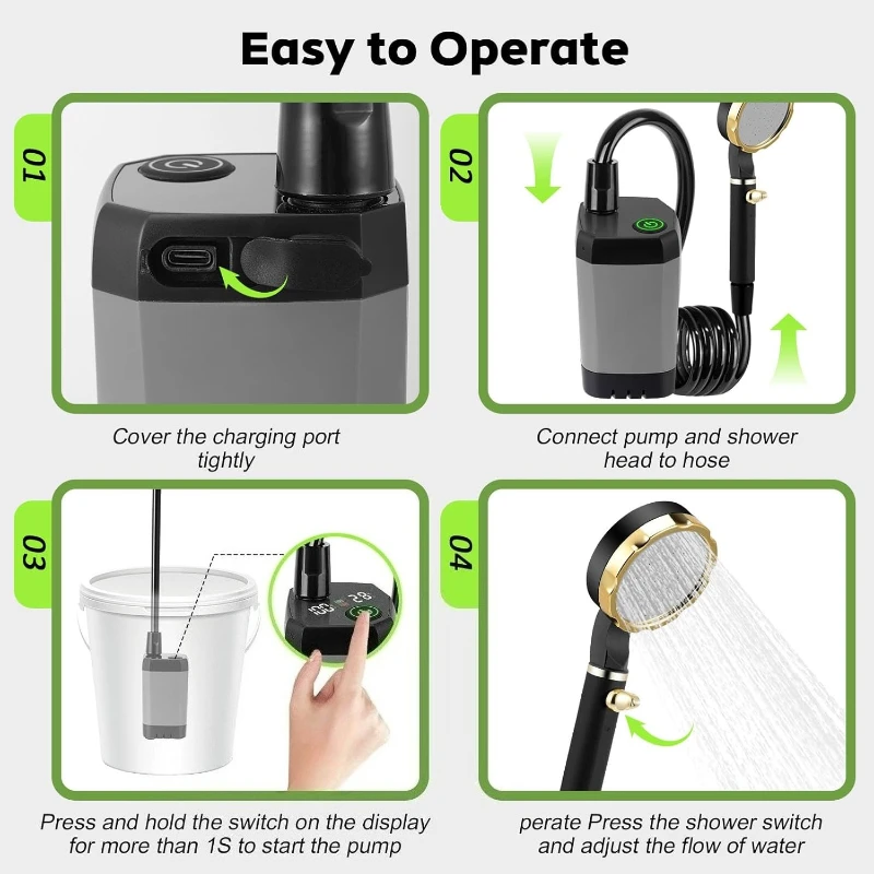 💦【Easy to Assemble and Operate】: Portable camping shower is very easy to use, just press and hold the switch on the pump for about 2 seconds to start the pump .You can control the water flow rate at will through the stepless adjustment knob on the shower head. With the water-stop ball valve design, the water flow rate increases by 150%.You can also switch between energy-saving mode and high-efficiency mode to easily control the water flow rate.